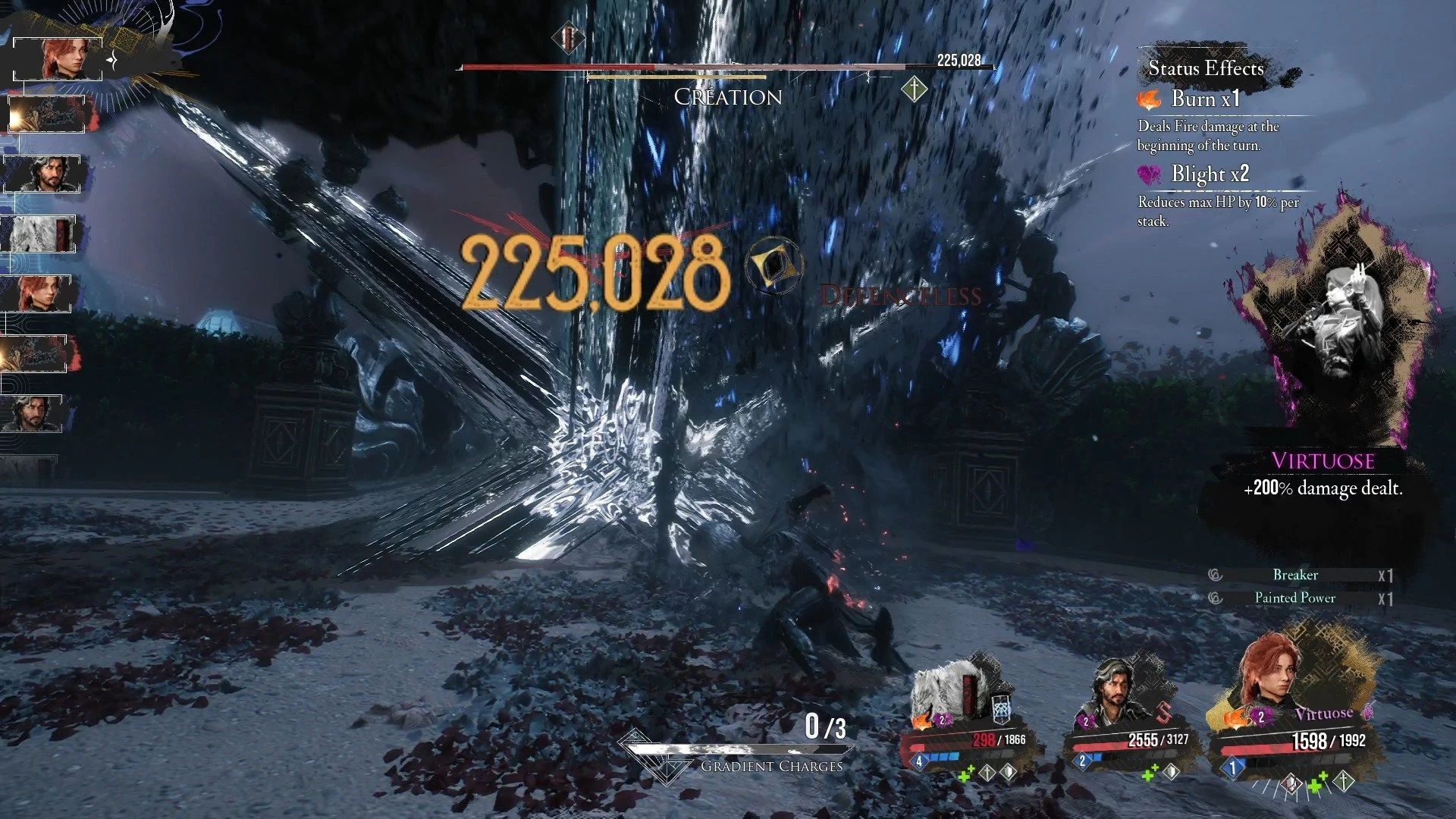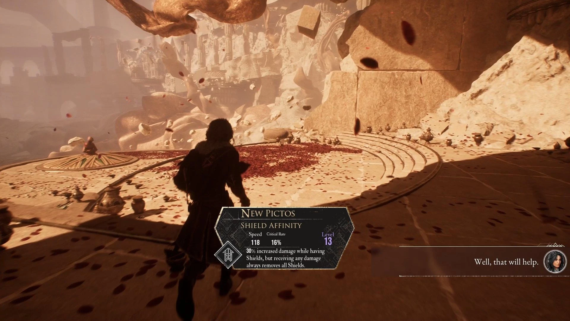 Тут есть один критически важный момент, без которого вся задумка провалится. Это, конечно же, Окрашенная Сила, которую ты автоматически получаешь за победу над Художницей, так что ее не пропустишь. Фишка в том, что она снимает лимит урона с ударов. Без нее Стендаль выдаст только 9999 урона, а с ней – сотни тысяч. Как только начнется третий акт, сразу же нацепи на Маэль (или другого перса) Раскрашенный пиктос силы, и когда она прокачается, назначь эффект Света всем членам команды. Это всего пять очков Люмины стоит.