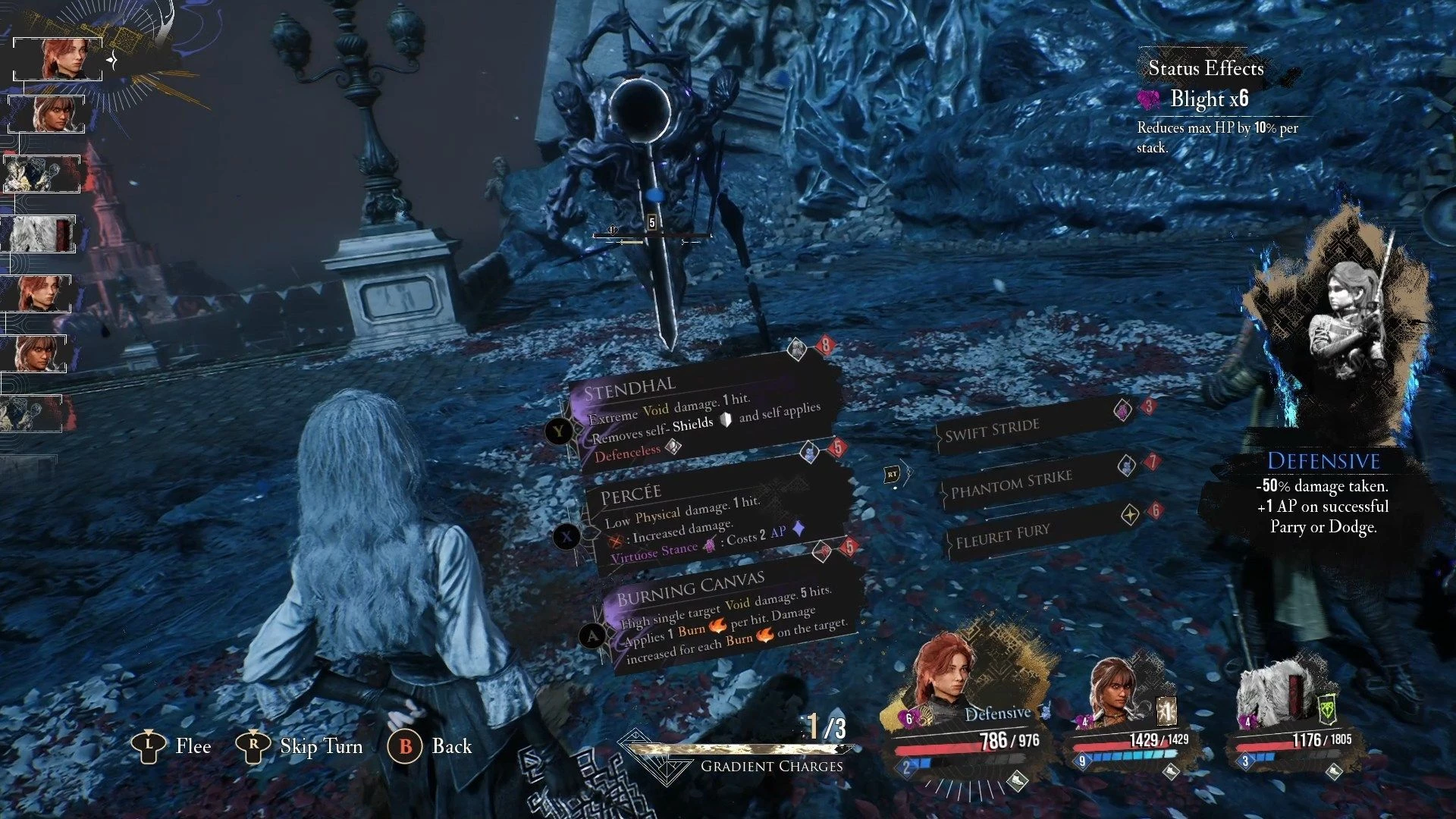 - "Удар призрака" (7 AP) – наносит четыре удара по области всем врагам и быстро заполняет шкалу градиентной атаки. Переводит Маэль в оборонительную позицию. Отличная атака по области, которая поможет чаще использовать градиентные атаки. Базовая градиентная атака Маэль переводит её в виртуозную позицию, упрощая использование "Стендаля".