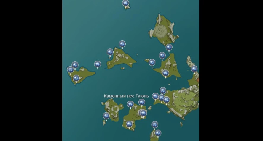 Существует три ключевых области для сбора звездных ракушек. Начнем с каменного леса Гуюнь. Телепортируйтесь к указанным на карте точкам и исследуйте острова в поисках ракушек.