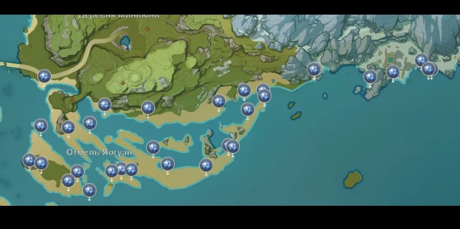 Самое большое скопление звездных ракушек находится на отмели Яогуан, что вполне закономерно – отступившая вода оставила здесь множество ценных артефактов и диковинок. Начните с одной из трех отмеченных на карте точек и двигайтесь в любом удобном для вас направлении.