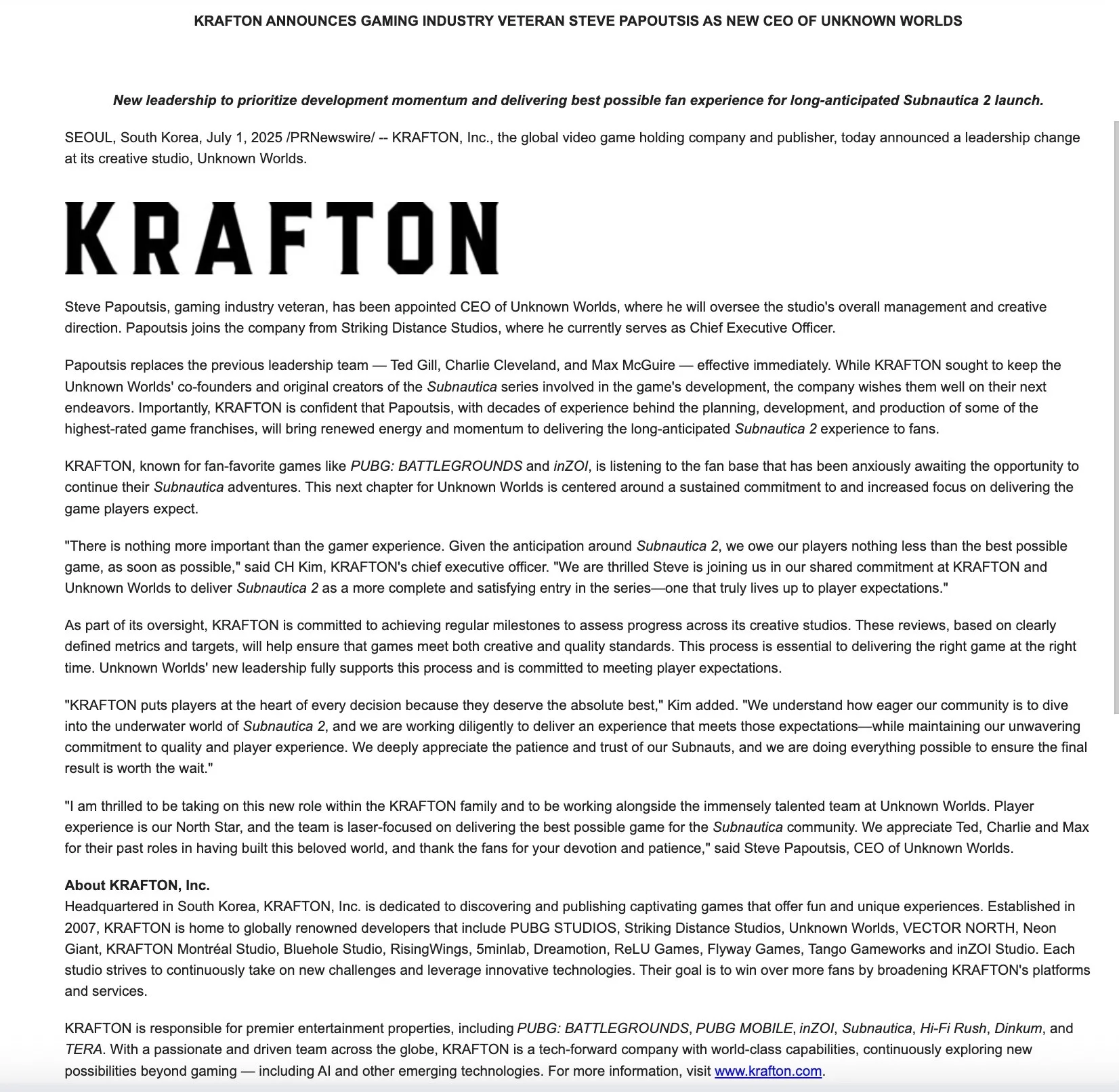 Krafton заявила, что компания "стремилась сохранить участие создателей Subnautica в будущих проектах", но "желает им успехов в их дальнейших начинаниях".
