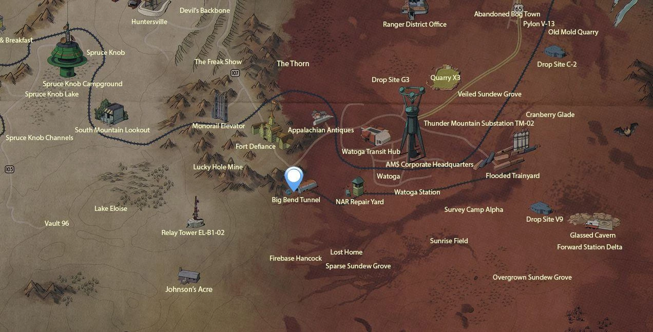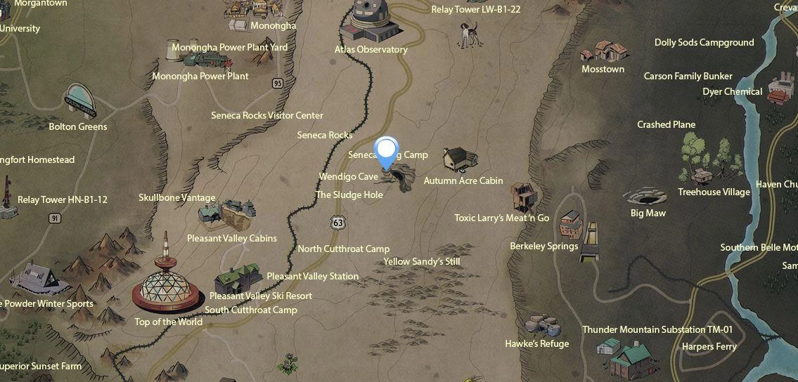 Пещера расположена в северо-восточном углу карты. Это одна из путевых точек для квестовой линии Анклава, и она заполнена монстрами. Есть также скрытый бункер внутри, охраняемый двумя Когтями Смерти 20 уровня.