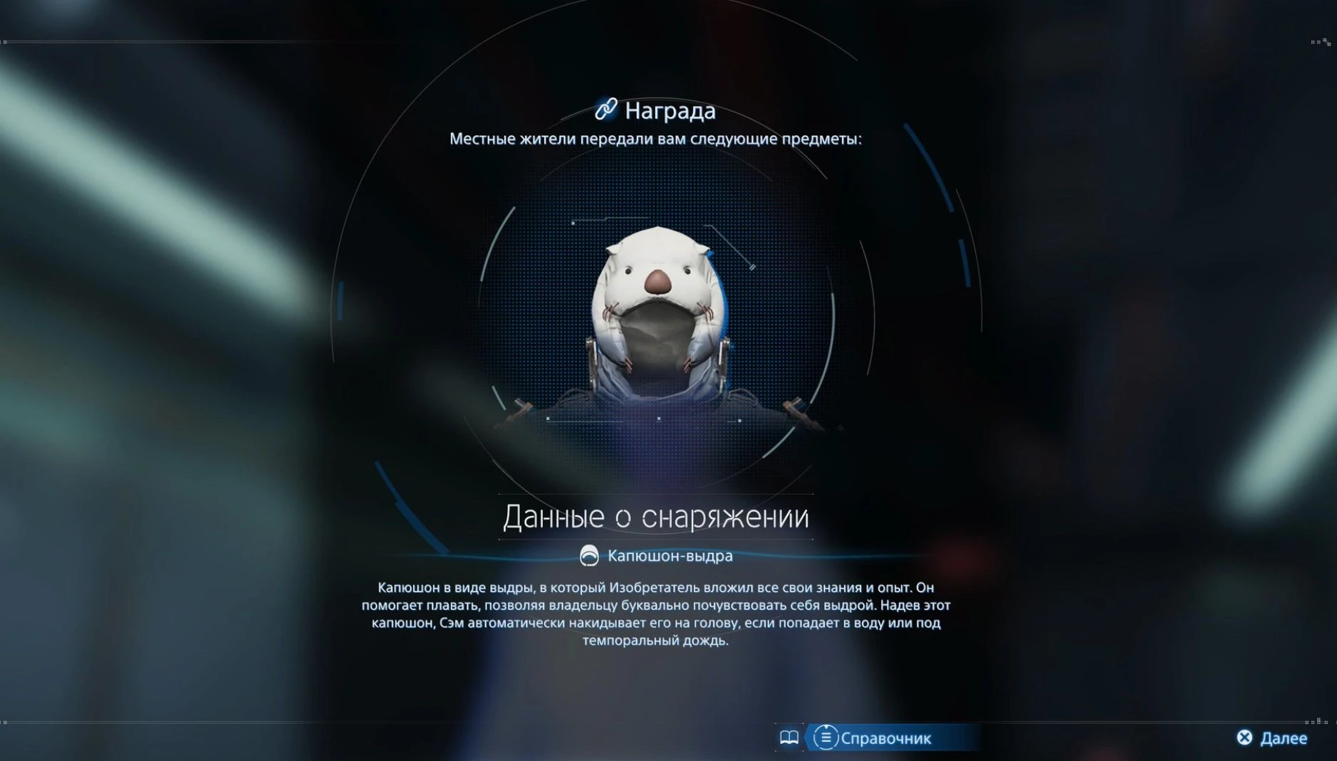 Доставив посылку Изобретателю, он без колебаний подключит свой бункер к хиральной сети и вручит Сэму уникальный подарок – капюшон в форме головы выдры, обеспечивающий защиту от дождя. Примечательно, что подобный капюшон был доступен и в оригинальной Death Stranding, о чем главный герой не преминет упомянуть в разговоре.