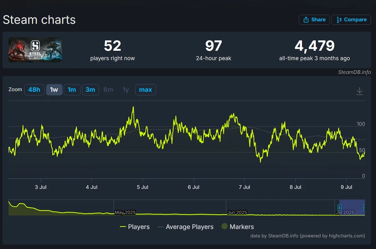 Игра появилась в раннем доступе Steam в апреле текущего года и достигла пика в 4 479 одновременных игроков. Однако, интерес быстро угас: в мае онлайн упал до 651, а в последние сутки составил всего 97 пользователей.