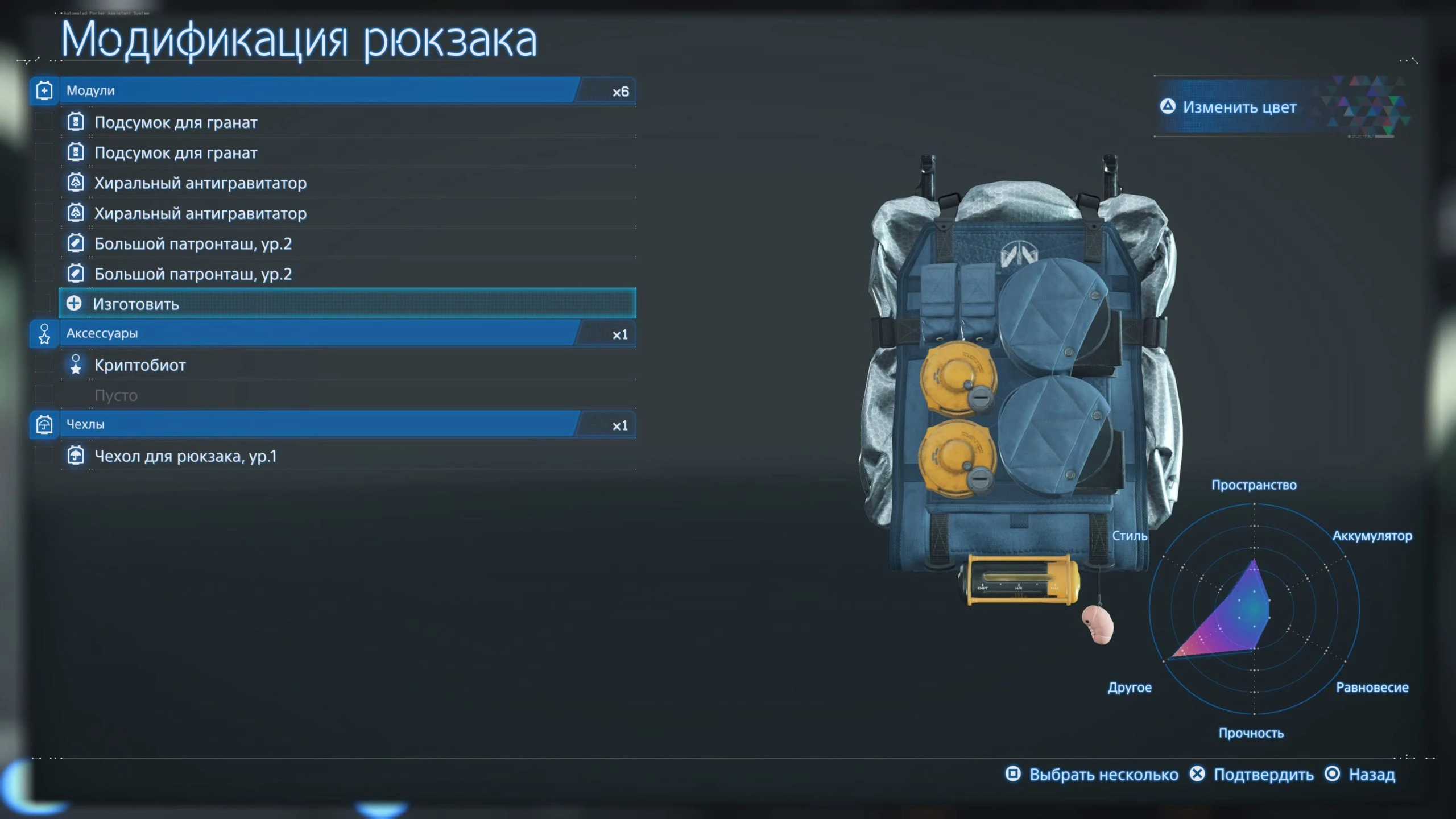 - В категории «Модули» выберите «Изготовить» и создайте патронташ. После этого прикрепите его к любому доступному слоту на рюкзаке. Помните, количество слотов ограничено, и вы не сможете установить бесконечное количество модулей.