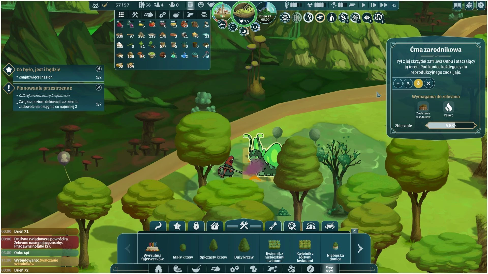 Не стоит забывать и про более приземленные задачи. Например, сбор навоза, который можно переработать в биогаз для сжигания ядовитых спор на спине Онбу. Игра внимательно следит за дефекацией, и мы даже получаем уведомления об успешных попытках. Кроме того, можно разрабатывать технологии для производства слабительных и стимуляторов. Использование различных стимуляторов и биодобавок может временно увеличить производительность Онбу.