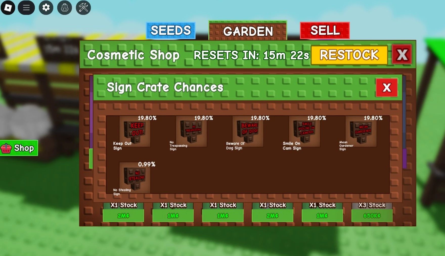 - Ящик с табличками (Sign Crate): Стоит 55 000 000 шекелей. Содержит таблички с надписями: "Злой садовник" (19,80%), "Улыбнись в камеру" (19,80%), "Осторожно, злая собака" (19,80%), "Посторонним вход воспрещён" (19,80%), "Не входить" (19,80%) или "Не воровать" (0,99%).