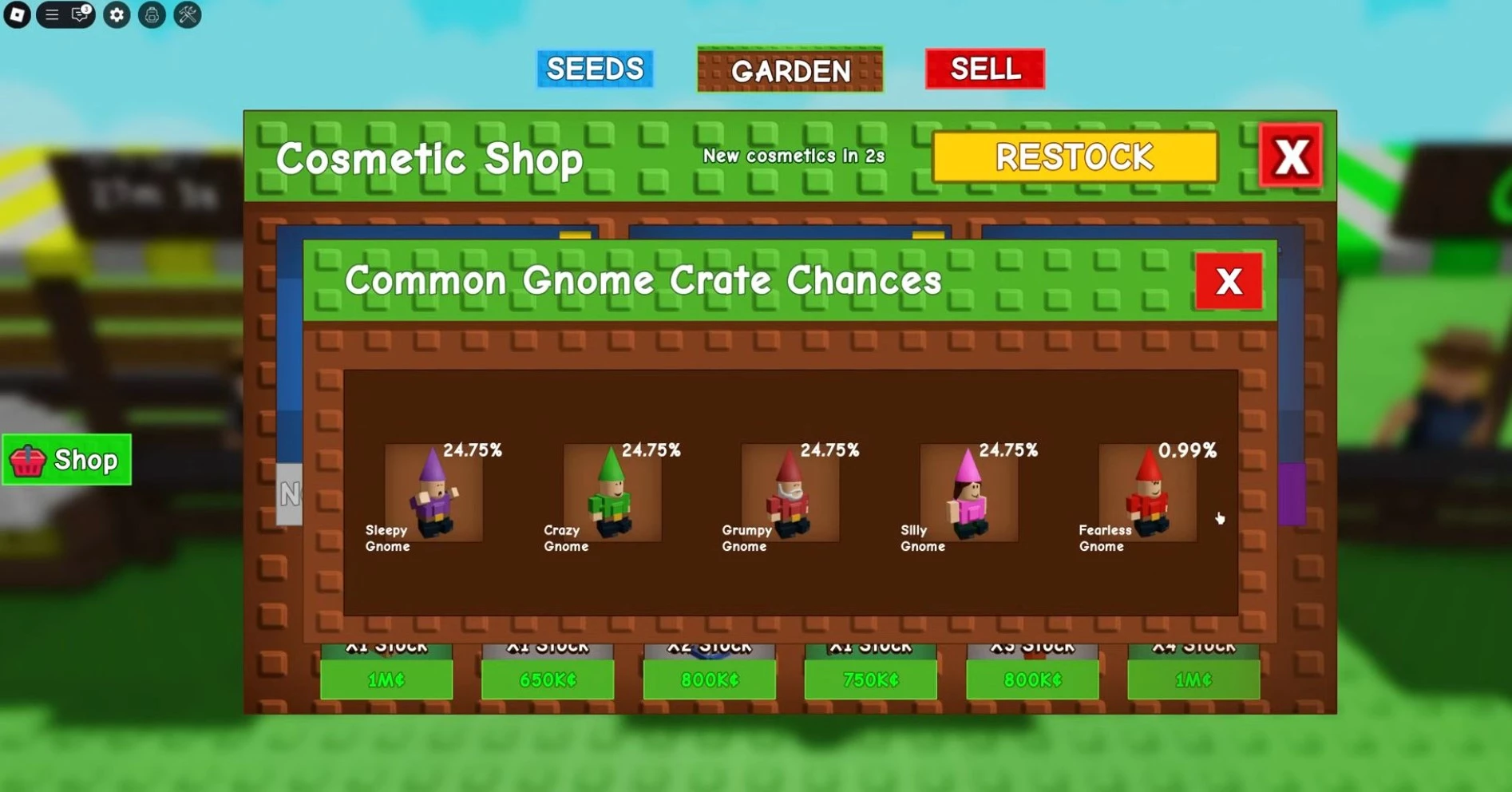 - Ящик с обычными гномами (Common Gnome Crate): Его стоимость составляет 56 000 000 шекелей. Внутри можно найти одного из следующих гномов: "Сумасшедший гном" (вероятность 24,75%), "Глупый гном" (24,75%), "Сонный гном" (24,75%), "Ворчливый гном" (24,75%) или "Бесстрашный гном" (0,99%).