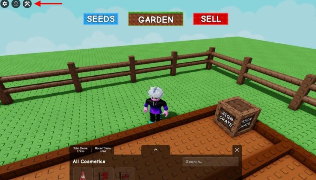 - Нажмите на значок "инструментов" в левом верхнем углу экрана. Откроется ваш косметический рюкзак. Выберите нужный предмет, чтобы разместить его в саду.