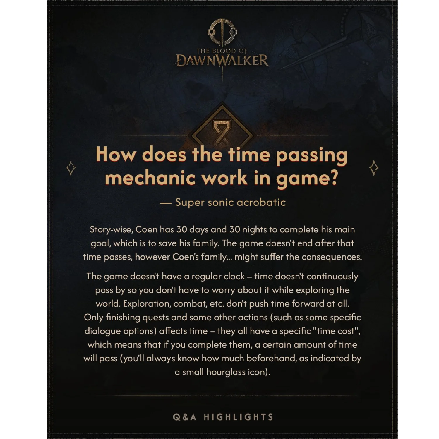 В The Blood of Dawnwalker у главного героя, Коэна, будет отведено 30 дней и 30 ночей для выполнения основной миссии. Истечение этого срока не приведет к немедленному завершению игры, однако может повлечь за собой серьезные последствия для его семьи.