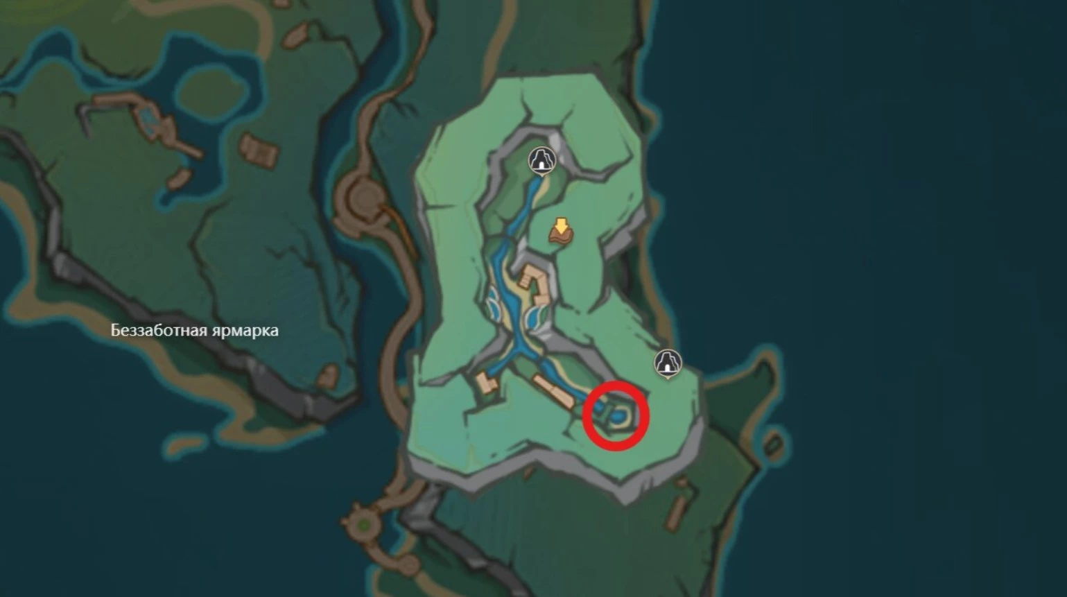Пещера находится к северу от статуи Архонта. В конце пути вы увидите отверстие в земле, частично прикрытое досками. Прыгайте прямо в эту дыру, но будьте готовы к предупреждению Паймон о возможных врагах внизу.