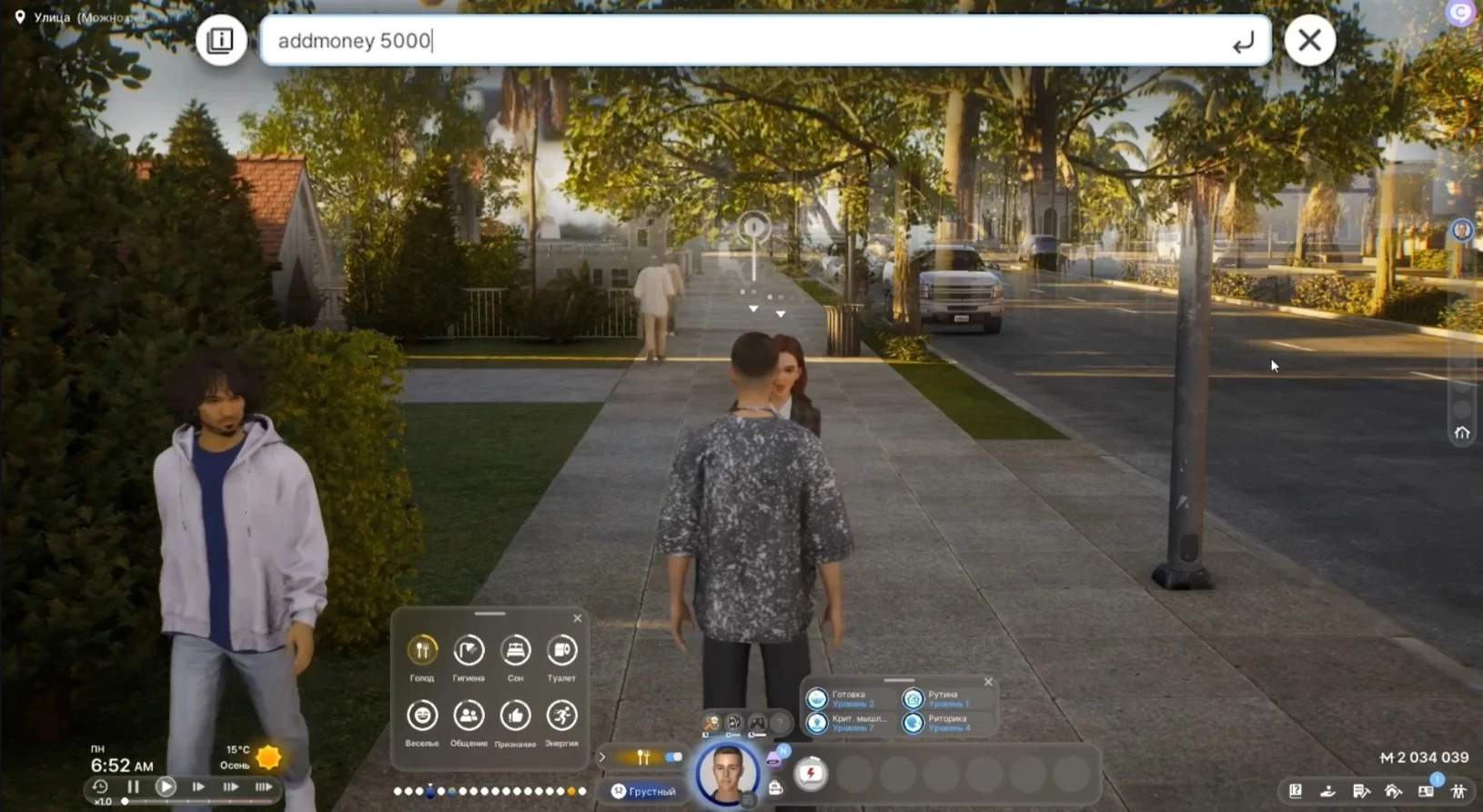 freezeAllNeeds [true/false] : Блокирует или снимает блокировку автоматического уменьшения всех потребностей выбранного персонажа.freezeAllNeedsSystem [true/false] : Аналогичная функция, но применяется ко всем персонажам в игре. Предотвращает общее снижение показателей потребностей.setNeedsFull : Немедленно восстанавливает все потребности персонажа до максимального уровня.setNeedsFull [ID потребности]: Восстанавливает до максимума конкретную потребность, указанную по её ID.