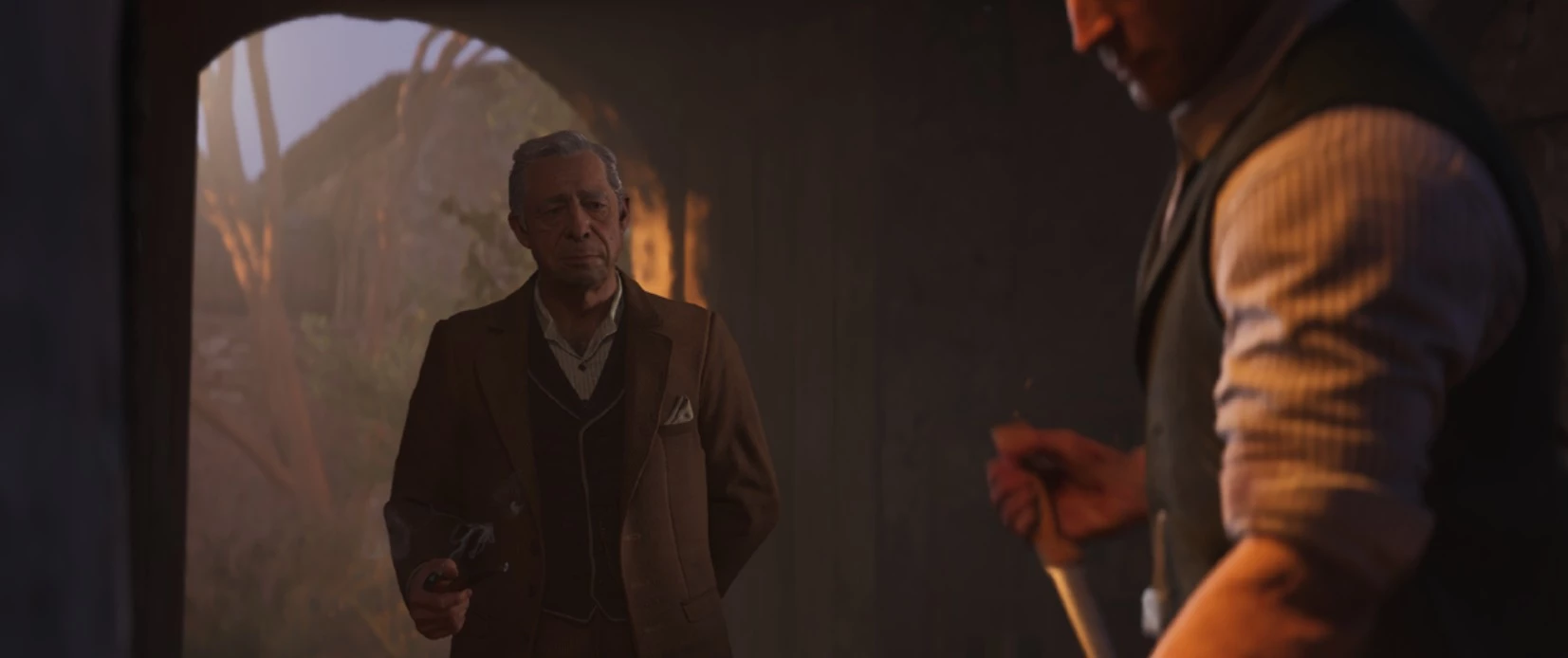 По скриншоту найдите коллекционную газету, которая лежит на маленькой деревянной скамейке в углу дома.