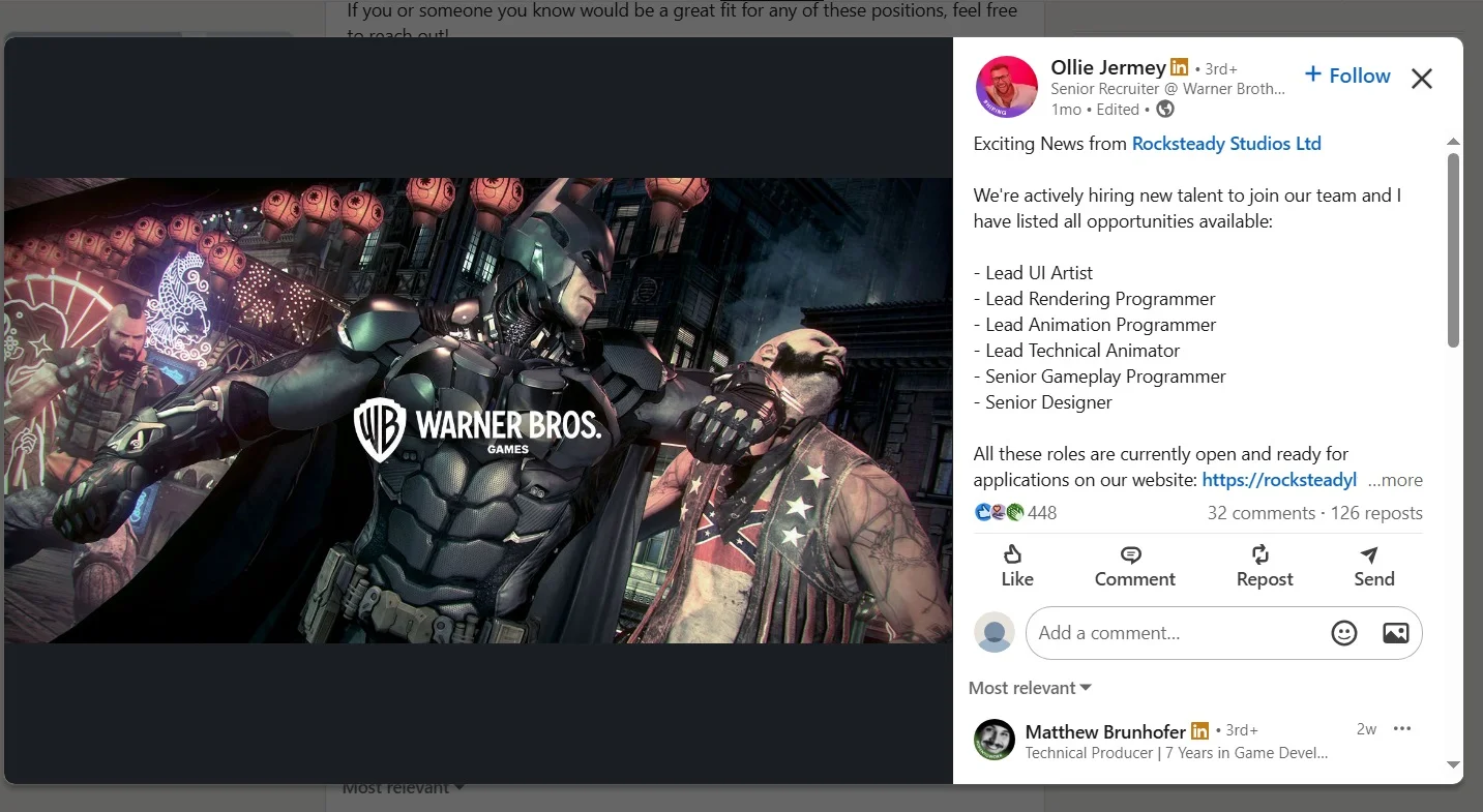 В студии Rocksteady Studios сменился геймдиректор. Им стал Билл Мани, опытный специалист из Ubisoft, работавший над многими частями Assassin's Creed, включая такие проекты, как Mirage, Valhalla и Origins. Судя по информации в LinkedIn, на новую должность он вступил в июле текущего года.
