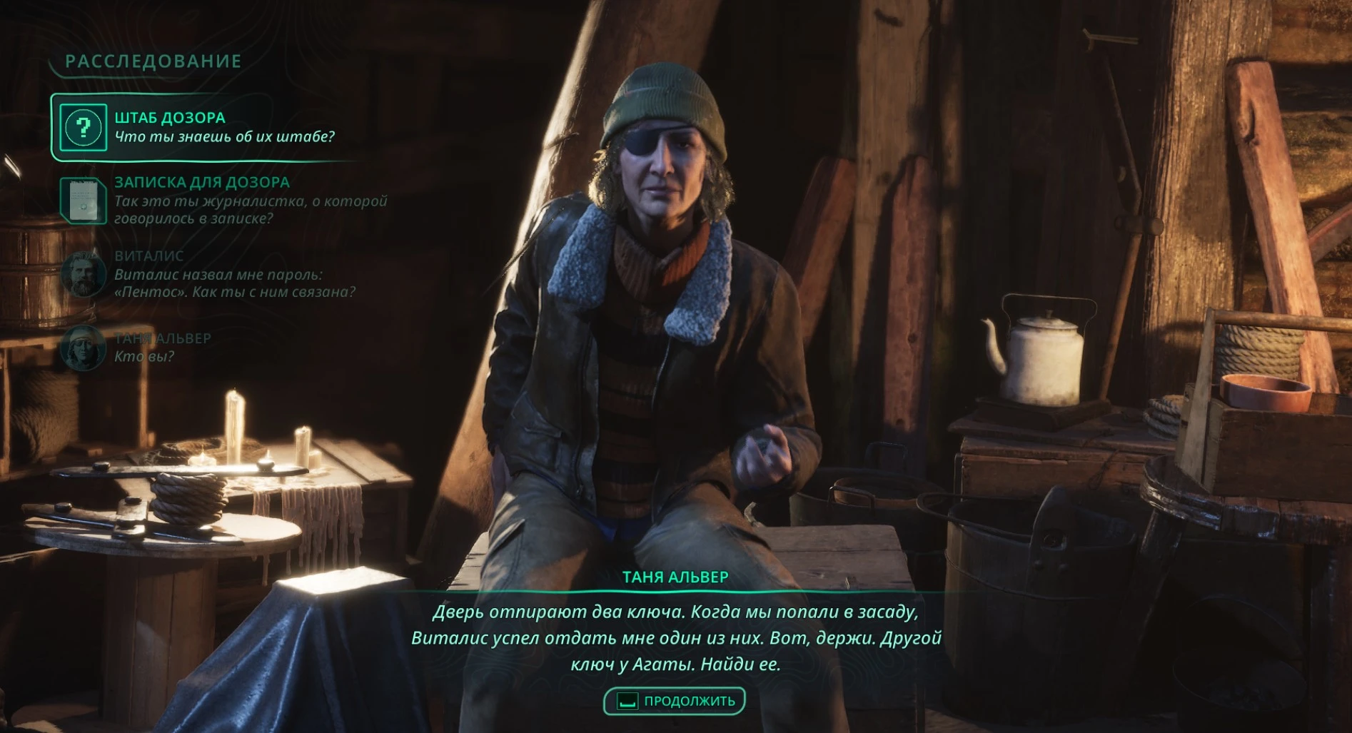 Она даже отдаст вам эмблему в виде свечи, которая нужна для прохода в секретное убежище, но дверь туда открывается двумя ключами, а второй находится у её подруги Агаты, которую также упоминал Виталис.