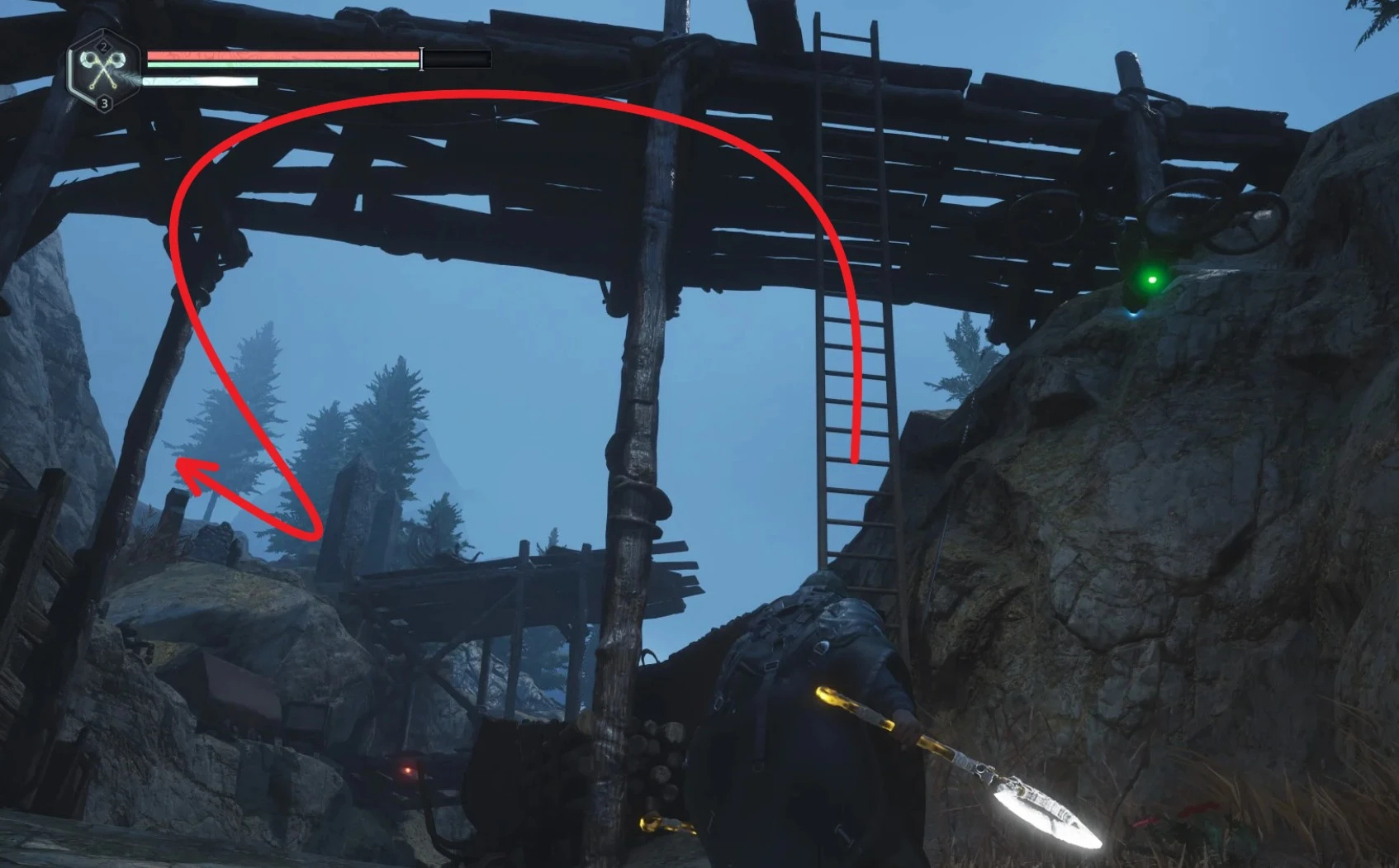 Вернитесь к тропе, ведущей к Тане, и сверните налево, проходя под деревянными конструкциями с лестницей. Игнорируйте врага, ведущего огонь сверху.