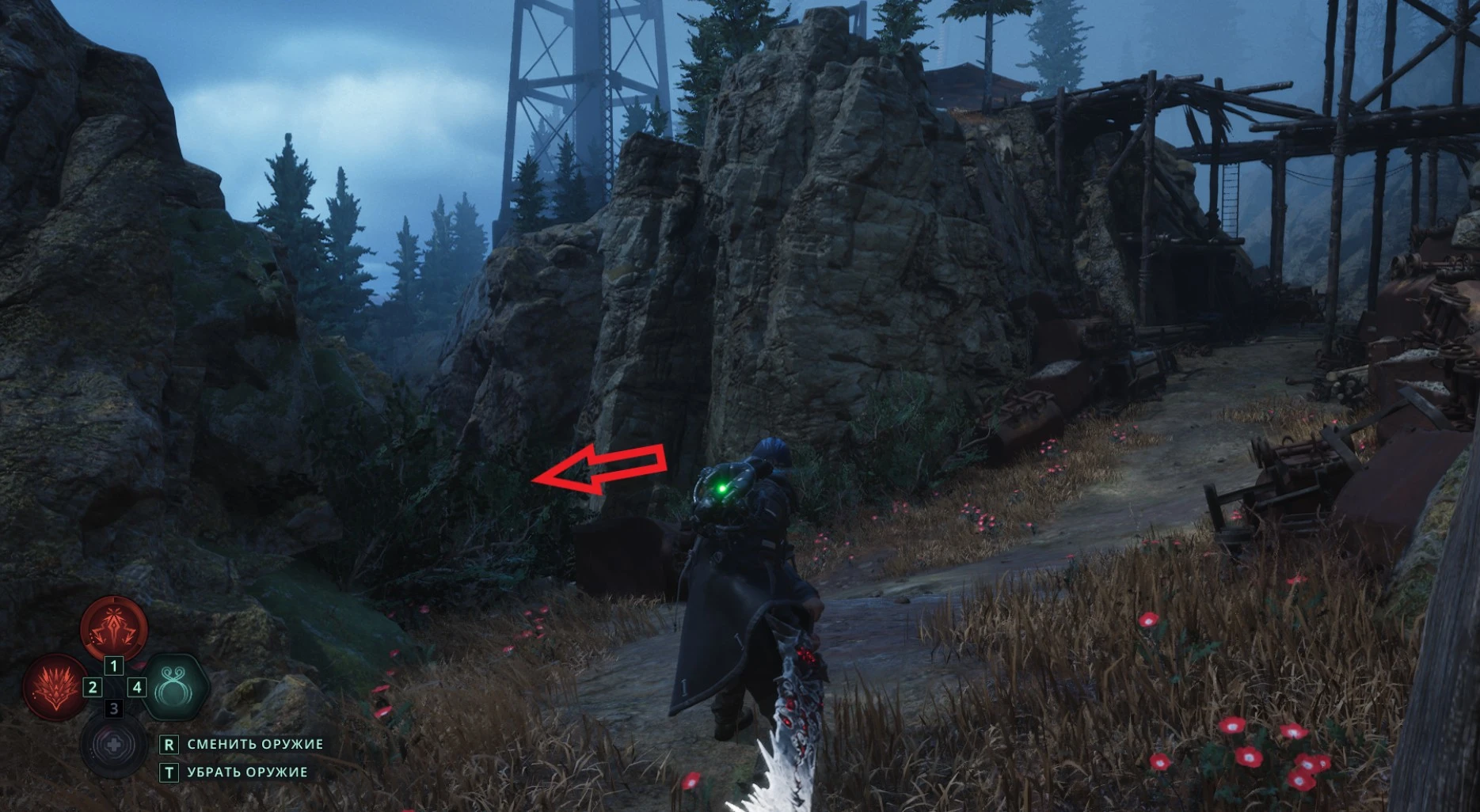 К слову, проход слева в будущем позволит немного сократить путь к Гнезду Наблюдателя, так как при следующем возвращении в Виссайские холмы БТР будет припаркован у места гибели Агаты, где возле хижины появится лестница.