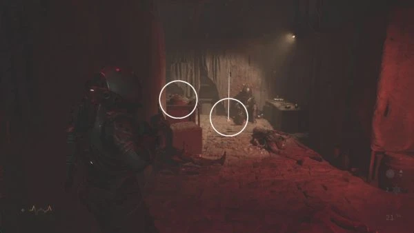 Двигайтесь по сюжету от точки сохранения станции B, пока не увидите ворота слева и дверь с цепью напротив. Сначала откройте дверь с цепью. Вас атакует мутировавший Сирота после взрыва ящиков. Победив его, идите в правую сторону. Избегайте кист и стенотрупа. Ищите дверь для продолжения игры.
