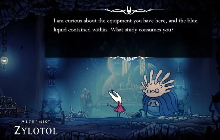 Алхимик ждет вас в самой высокой точке карты, над высокой стеной, доступ к которой потребует "Цепкий захват". Чтобы его получить, отправляйтесь в Панцирный лес, одолейте Сестру Лучину и получите "Цепкий захват", взаимодействуя со статуей Херры. После этого вы сможете добраться до Алхимика. Рекомендуется завершить спасение всех жителей Звонвилля до выполнения задания, чтобы получить доступ к Иглончели, открывающей новые навыки и возможности. Сядьте на скамью рядом с Алхимиком и подготовьте сосуд с иглой. Без него вы не сможете собирать плазмиум.