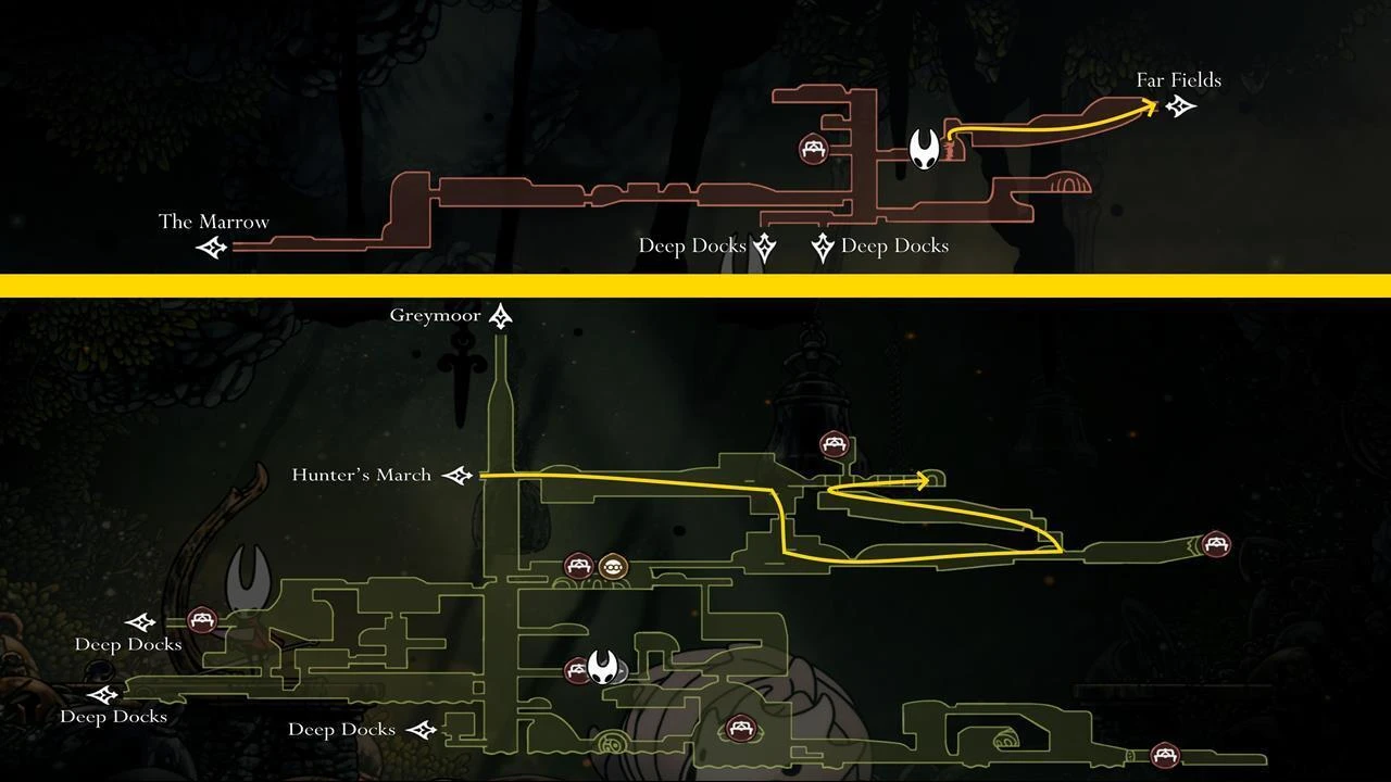 - Местоположение: "Марш Охотника в Далёкие Поля" (Hunter's March in Distant Fields). Сначала доберитесь до статуи кролика в "Марше Охотника". Используйте "Силксоар" (Silksoar), чтобы добраться до секретного прохода, ведущего в другую часть Далёких Полей.