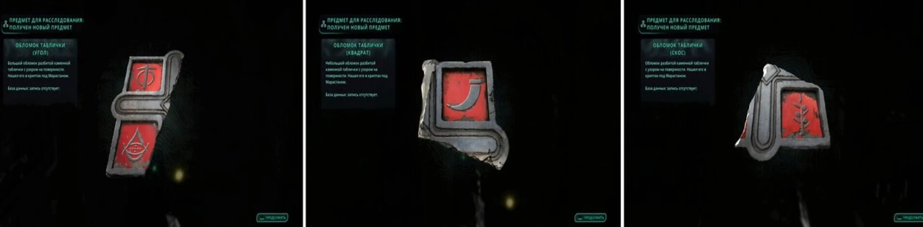 Мрачные и похожие катакомбы вряд ли помогут вам с ориентацией по скриншотам, но они несложные, с несколькими развилками и дверью с рычагом. Без труда найдите там три фрагмента таблички (угол, квадрат и скос).