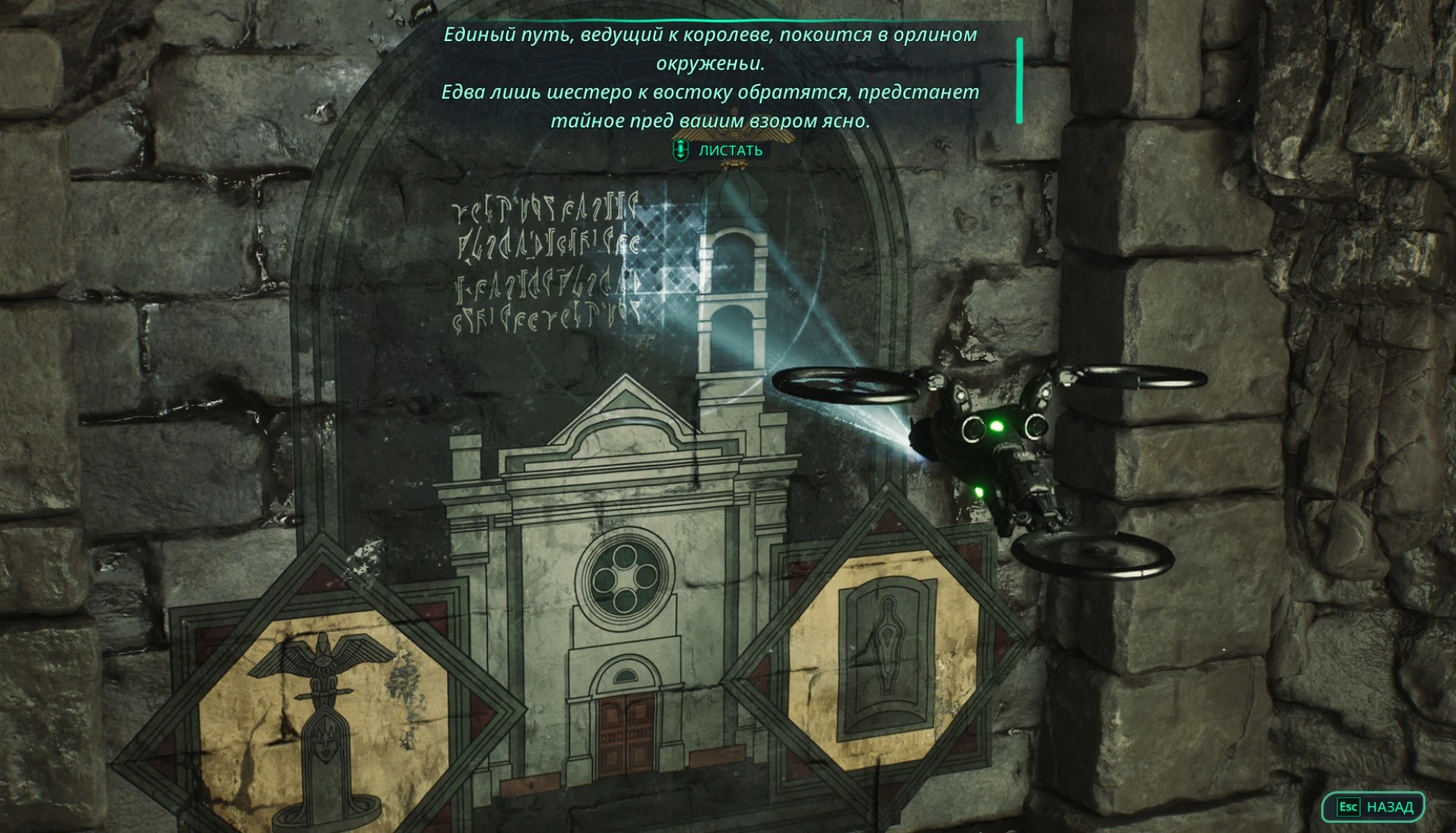 Текст на стене обсерватории гласит, что путь к королеве откроется лишь тогда, когда все орлы будут смотреть на восток. Рядом изображен храм, крышка саркофага и статуя птицы. По всей видимости, именно там и стоит искать ключ.