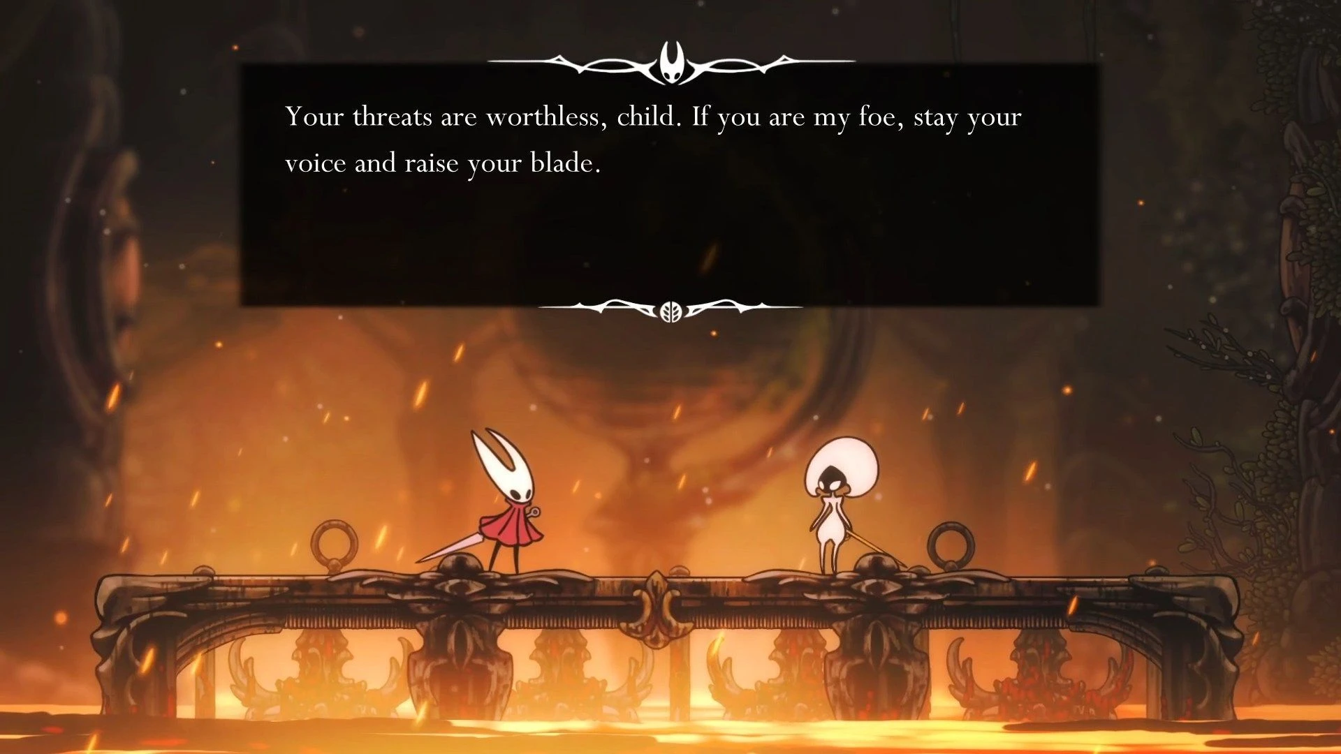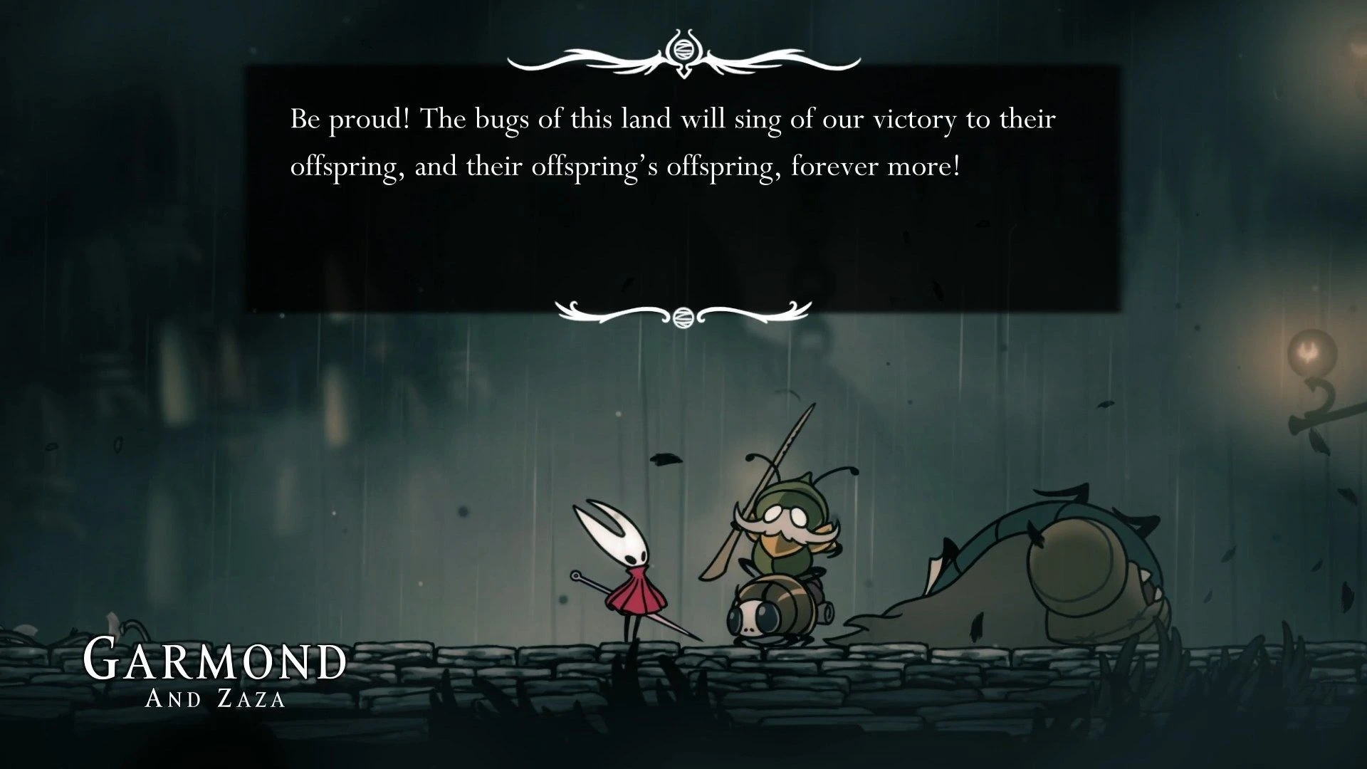 Говоря о персонажах, нельзя не упомянуть Хорнет. В отличие от Молчаливого Рыцаря из первой части, дочь Халлоунеста более эмпатична. Ее диалоги отражают как утонченность принцессы, так и опыт охотницы. Она уверена в себе, умна и добросердечна. Хорнет не совершает ошибок, борясь со своей божественной природой, пробуждающей жажду власти. Ее встречи и битвы с Лаце – блестяще выполнены. Соперница запоминающаяся, надменная и агрессивная, но и достаточно человечная, чтобы вызвать сочувствие, когда узнаешь ее историю.