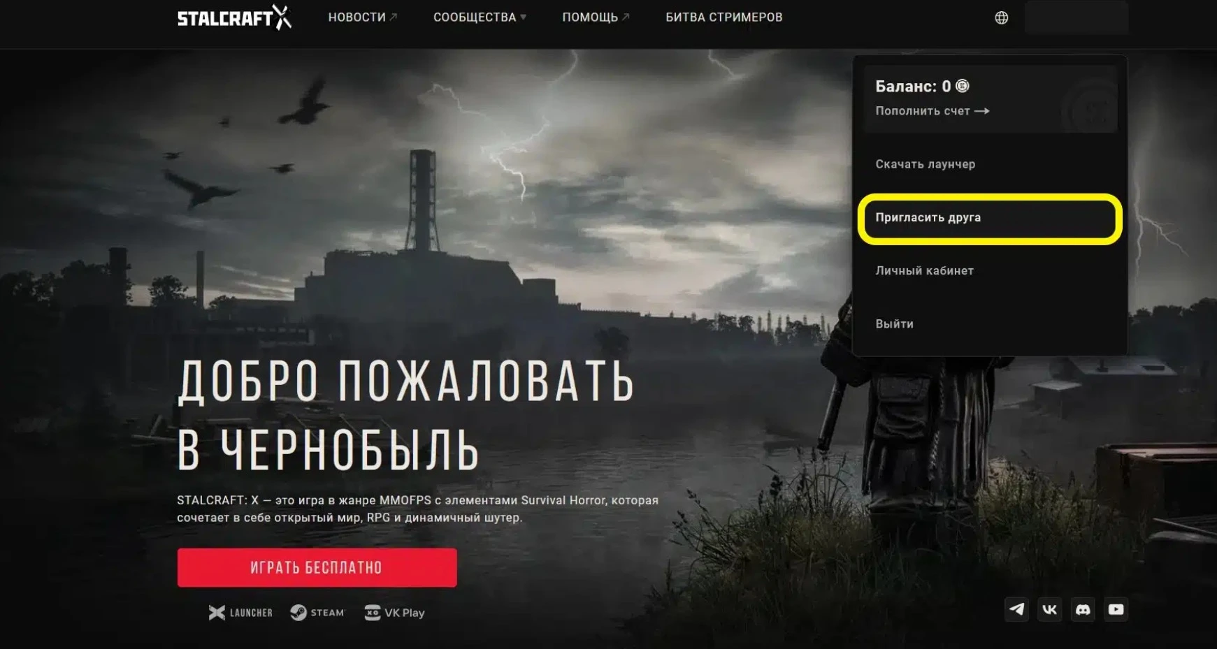 Любой игрок может сгенерировать реферальную ссылку в личном кабинете на сайте Stalcraft X. Поделитесь ссылкой с другом, чтобы он получил стартовое снаряжение, а вы – процент от его будущих донатов.