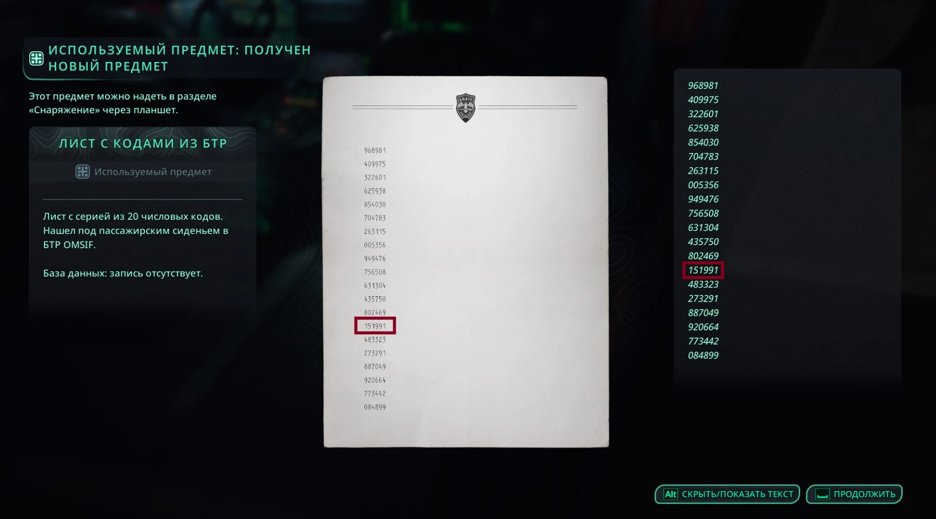 Там вы найдете записку с цифрами, которые, по словам незнакомки, являются списком паролей от ворот базы, сменяющихся каждый день. Сейчас 14-я смена, а значит код 151991 актуален.