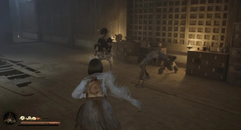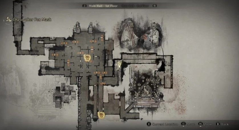Важно отметить, что чердак – одна из немногих локаций Главного зала, становящаяся более опасной в "Новой игре+". Здесь обитает Ои-омои с тремя "яйцами", из которых появляются монстры. После зачистки чердака на западной стене проявится печать, на которой можно сконцентрироваться, чтобы разрушить преграду. Стена исчезнет, открывая секретную боковую комнату с трупом и дверью, отмеченной символом.