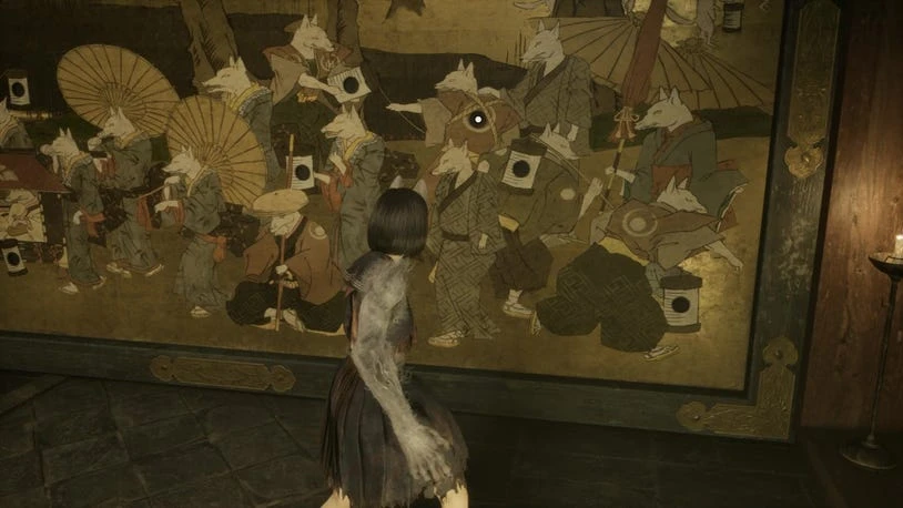 Загадка «Настенная роспись» заслуженно считается самой трудной в Silent Hill f, и ее сложность не зависит от выбранного уровня прохождения. Суть задачи состоит в том, чтобы правильно разместить три найденных вами герба (Лисьей маски, Чёрного воробья и Белого воробья) в трех из девяти гнезд на странной фреске с лисами.