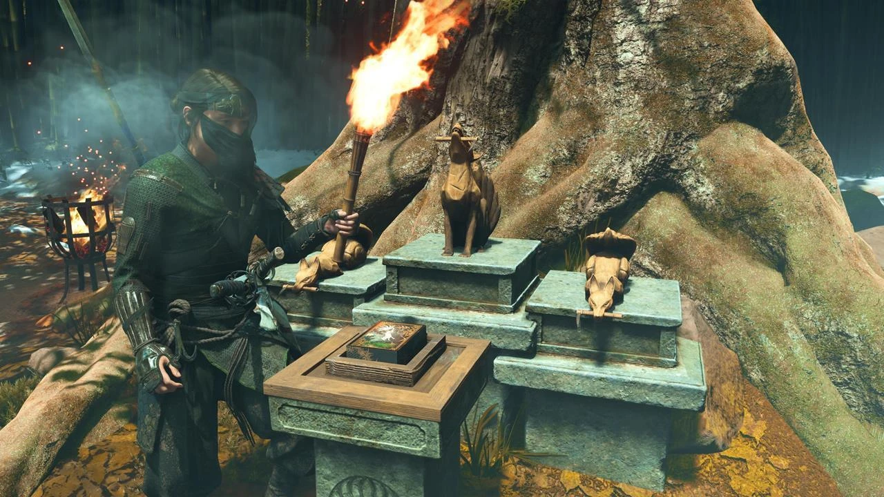 - Местоположение: В логове головоломки у входа: слева - зажгите крайние фонари, справа - поверните статуи лис (влево, вперед, вправо и назад).