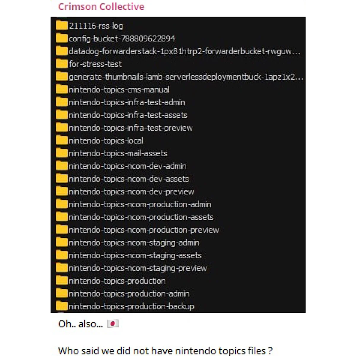 Группа хакеров Crimson Collective сообщила о несанкционированном проникновении в системы Nintendo. В подтверждение своих действий они продемонстрировали скриншот, содержащий содержимое внутренних папок компании, включая рабочие материалы, девелоперские версии и бэкапы.