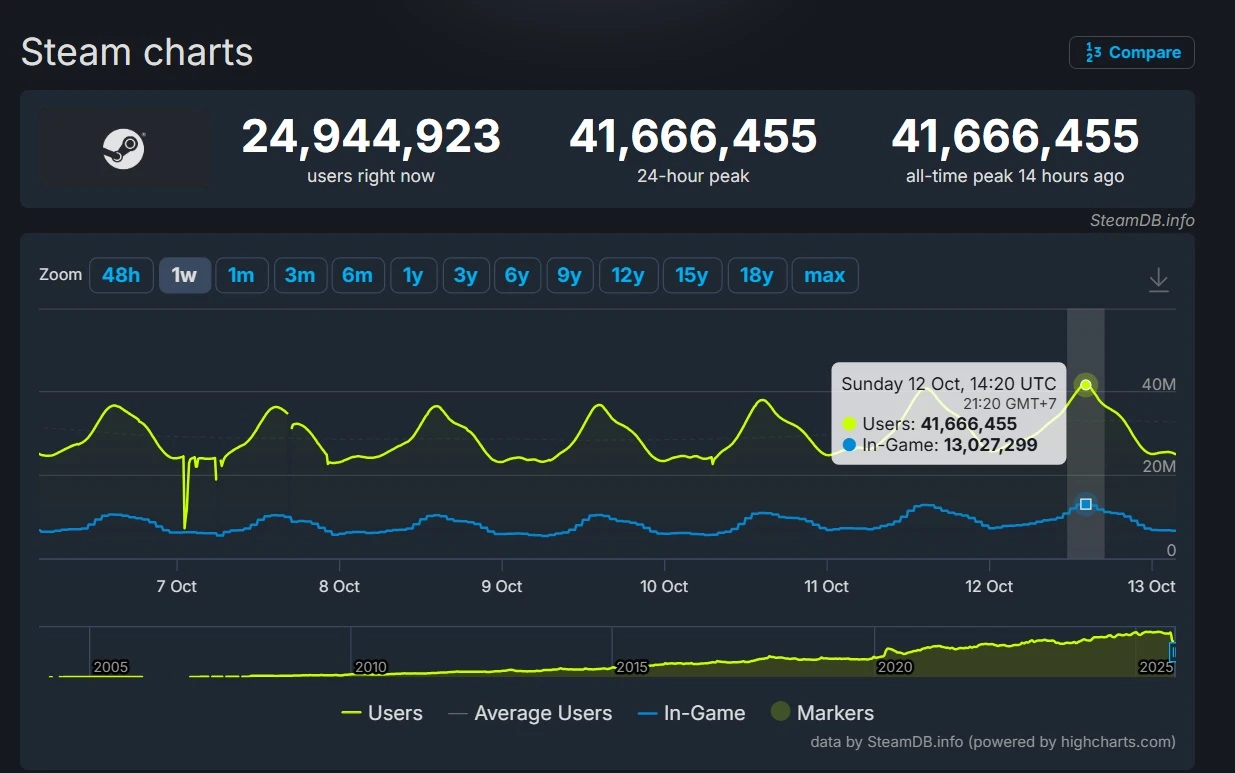 12 октября 2025 года Steam зафиксировал новый рекорд по числу одновременно находящихся в системе пользователей, достигнув отметки в 41 666 455 человек.