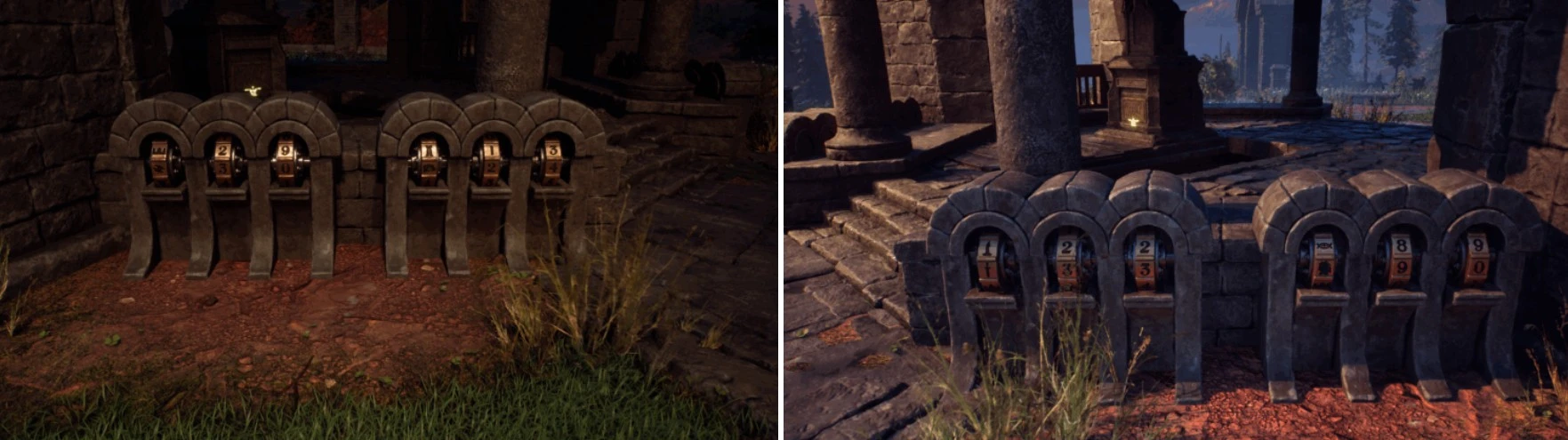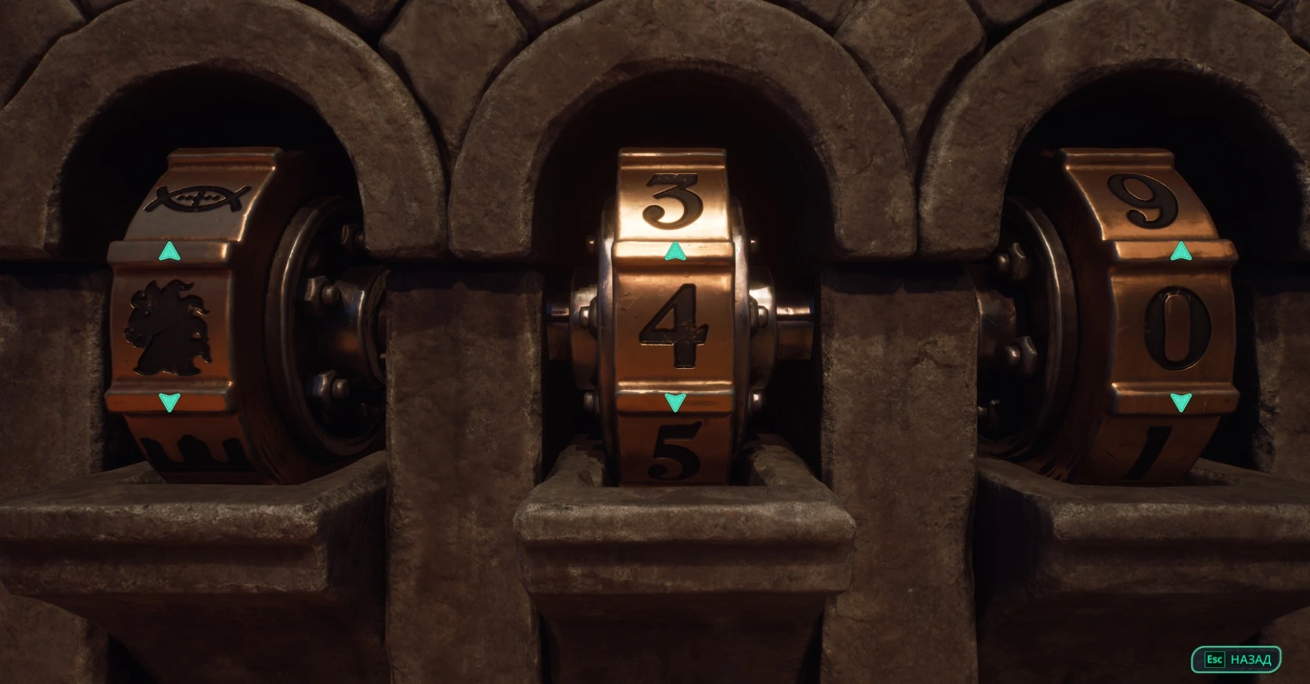Однако, осмотрев четыре каменные постройки неподалеку, вы обнаружите механизмы с тремя барабанами в каждой.