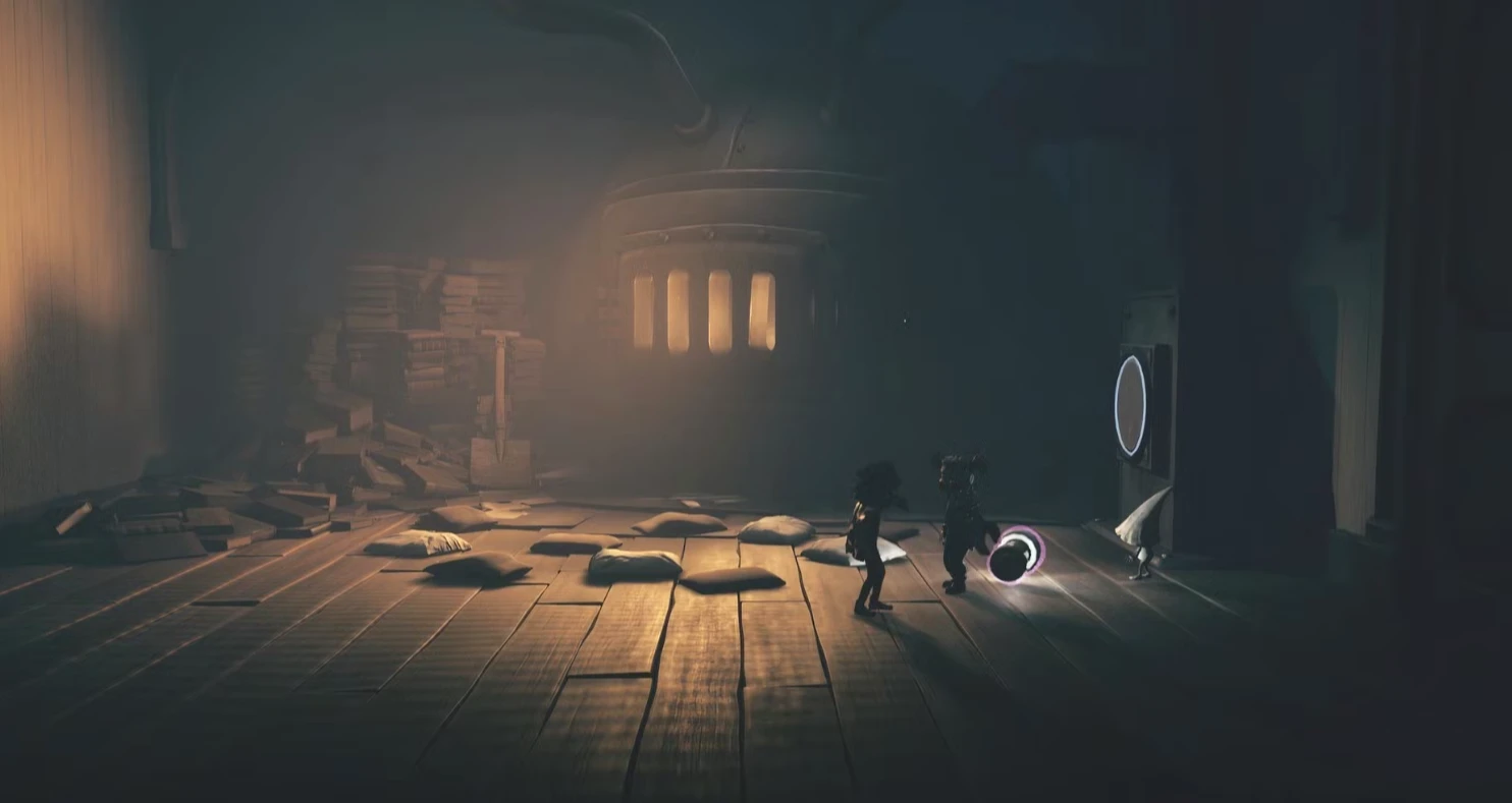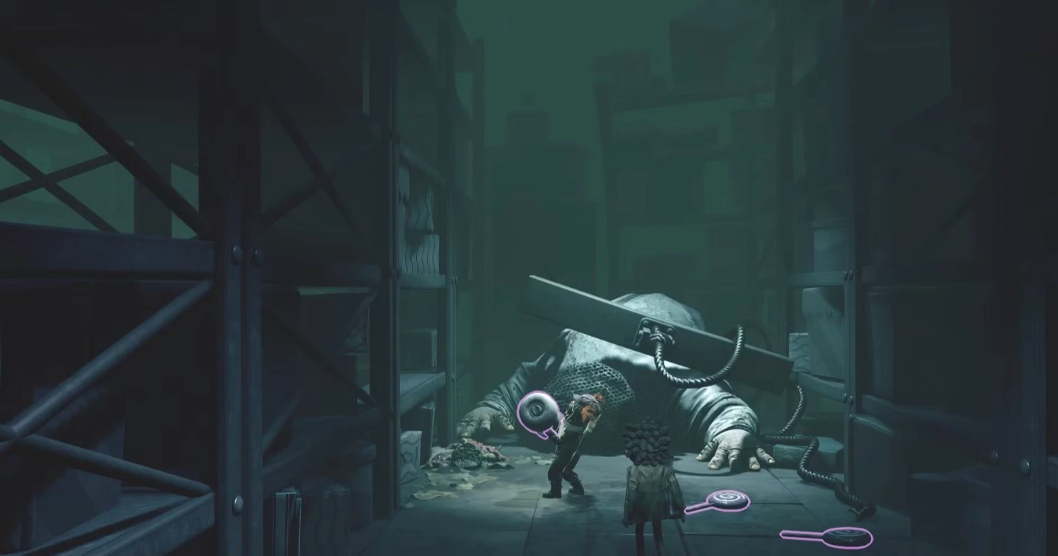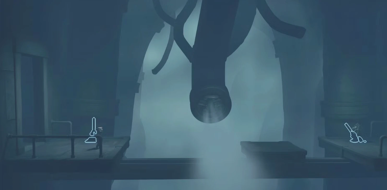 Самым первым серьёзным препятствием в Little Nightmares 3 станет закрытая дверь в локации «Некрополь». Чтобы найти ключ, двигайтесь влево и перейдите по нескольким деревянным мосткам, пока не дойдёте до рычага с рукояткой. Один игрок должен вращать рукоятку, а второй – стоять на опускающемся ящике. Когда второй игрок окажется на ящике, первый должен снова повернуть рукоятку, чтобы поднять платформу. Поднявшись наверх, второй игрок должен потянуть за рычаг справа – это опустит лестницу для первого игрока. Когда оба окажутся на верхней площадке, пройдите к дверному проёму слева и уберите доску, преграждающую путь.