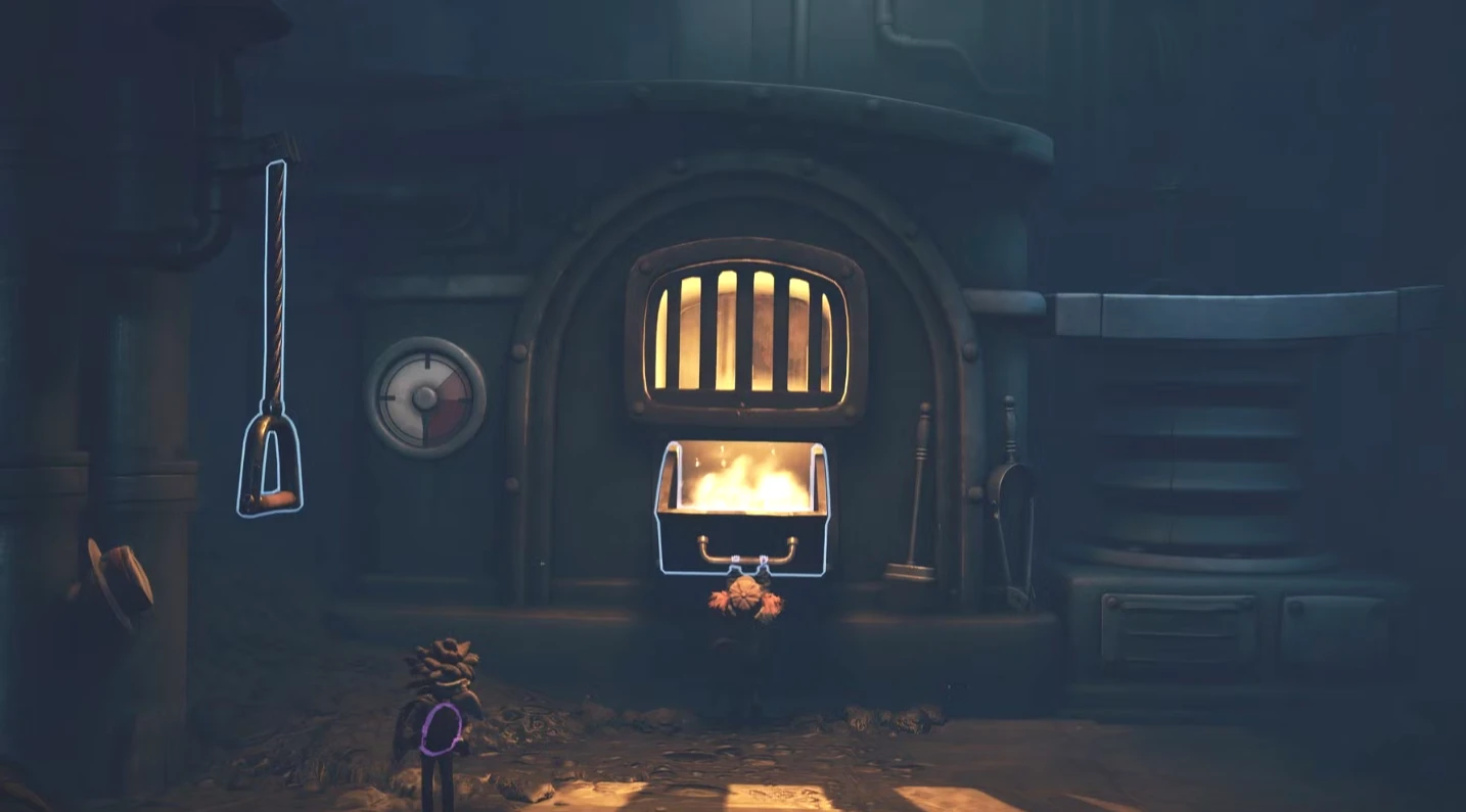 После преодоления запертой двери вы окажетесь снаружи, а затем войдете в помещение с печью. При попытке потянуть за рычаг поддувала ничего не произойдет. Необходимо зажечь печь. Для этого один из игроков должен удерживать дверцу топки в открытом состоянии, а второй - непрерывно загружать в нее уголь. Продолжайте добавлять уголь до заполнения топливного отсека. Когда указатель на левом индикаторе достигнет красной отметки, это будет сигналом о достаточном количестве топлива. После этого нужно потянуть рычаг поддувала для активации механизма.