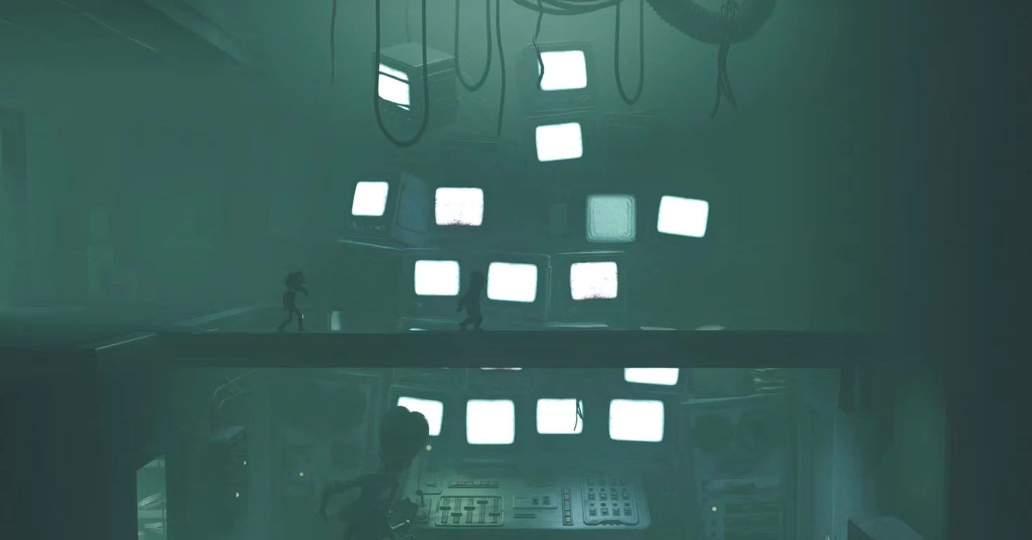 Чтобы миновать эту камеру, продвиньтесь к шкафу: один из персонажей должен открыть выдвижной ящик справа, а другой использовать его в качестве ступеньки. Забраться сможет только один, поскольку ящик зафиксируется, как только вы его отпустите. Внутри этой комнаты находятся несколько мониторов, отображающих различные зоны Кондитерской фабрики, а вдали слева расположен рычаг. Сначала подойдите к неисправному телевизору слева и отодвиньте его вправо, расположив его перед дверью. Это позволит вашему напарнику попасть внутрь (дверь теперь не закроется полностью).