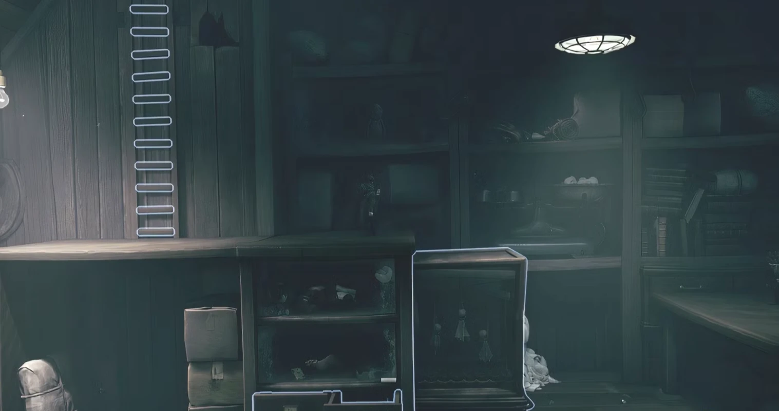Прямого доступа нет, так что Малой должен выпустить стрелу, разбив бутылку и спугнув нома, чтобы тот выкатил лестницу. Если Малой не стреляет сам, а вы управляете Одной, подозовите его в середину комнаты — к точке напротив полки. Перед подъёмом вытащите тележку из-под левого стола. Когда путь расчистится, разбегитесь от правого стола и прыгните — оттуда удастся взобраться по лестнице и продвинуться по третьей главе.