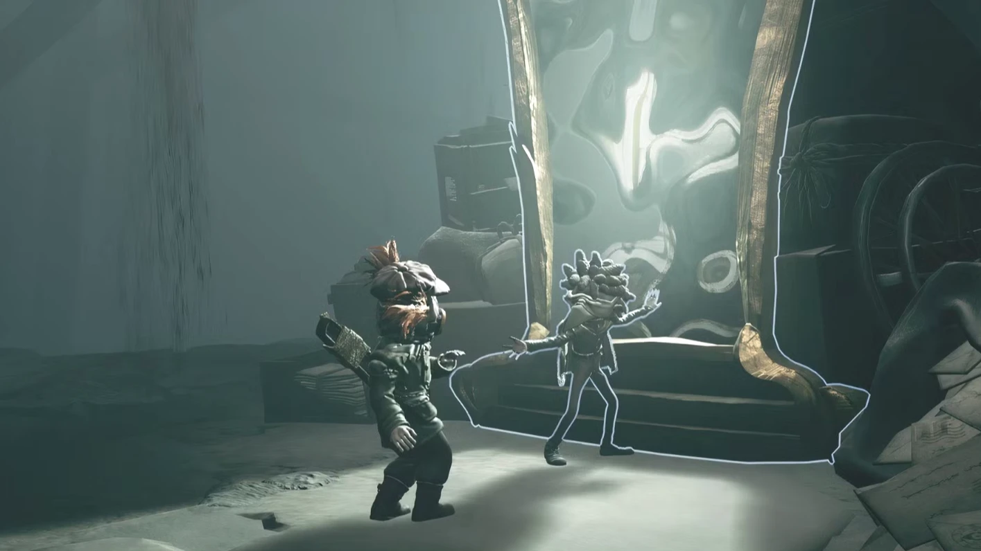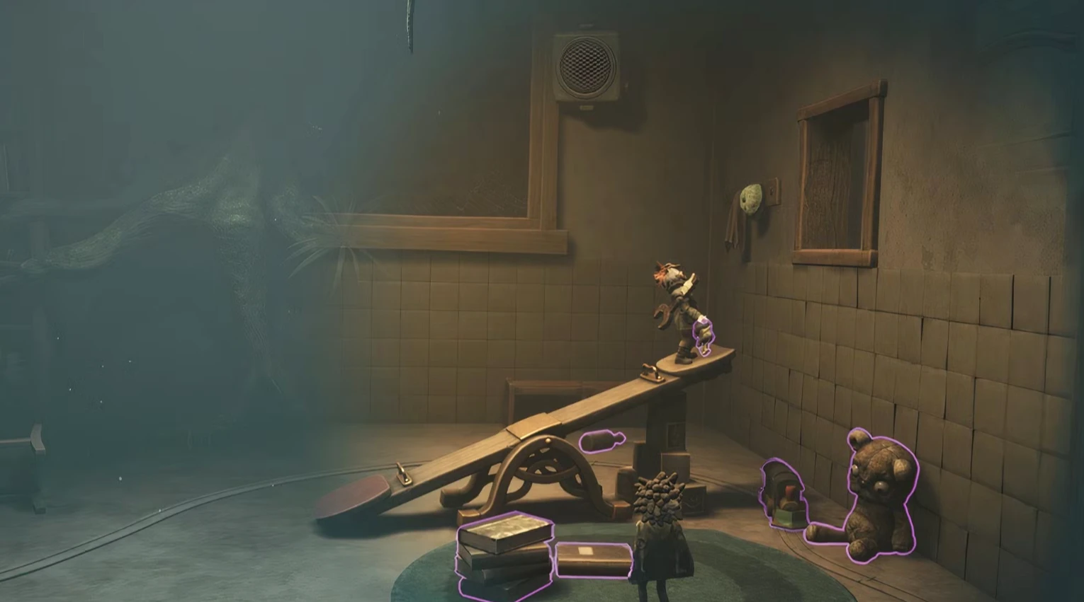 Запрыгните на коробки и поднимитесь по ним, чтобы найти маленькое окно в углу стены. Пролезьте через него и спуститесь по верёвке в комнату из воспоминаний. Двигайтесь к мусоропроводу слева и попросите персонажа подсадить другого, чтобы открыть его. Из него выпадут мусор и кукла, похожая на одного из персонажей. Взаимодействие с куклой активирует её способность к управлению временем. Возьмите её и вернитесь в комнату с игрушками.