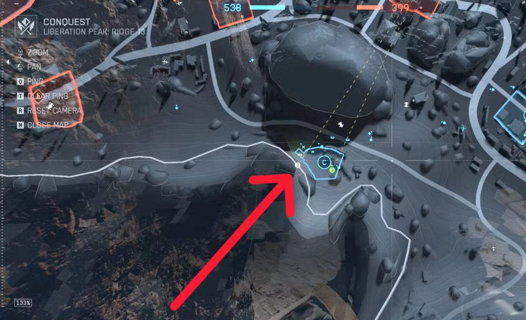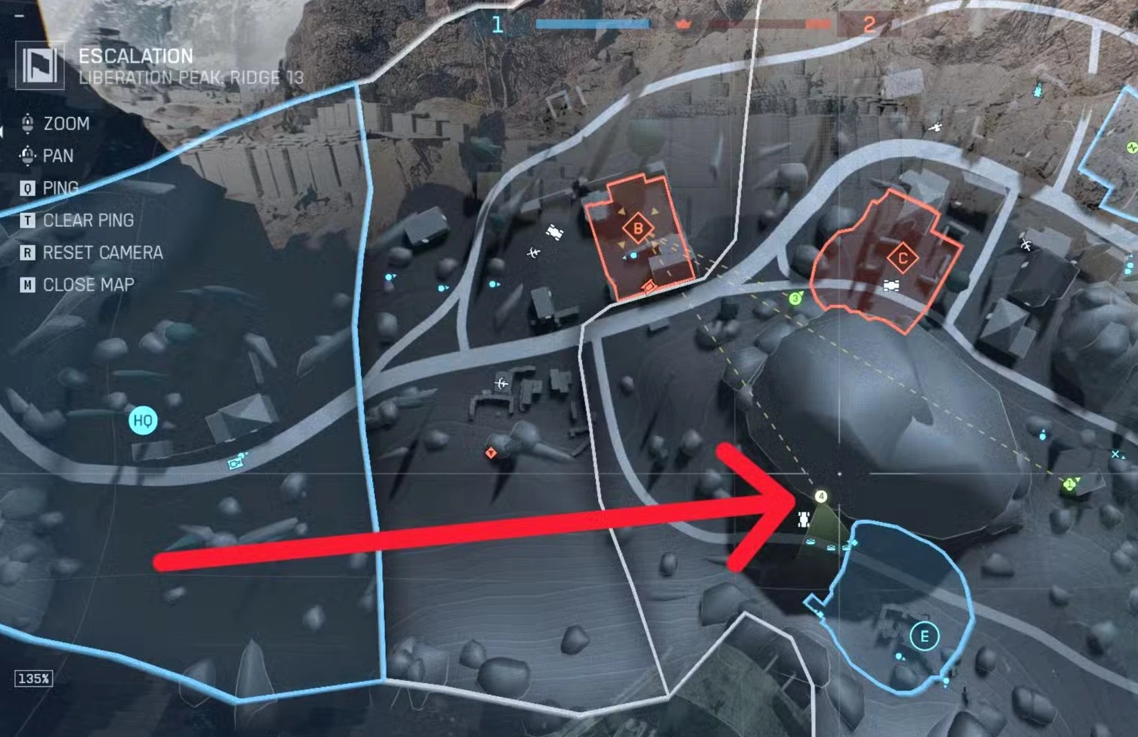 С хребта открывается прямой обзор на цели B и C, а также на перемещения противников в сторону ущелья. Важно контролировать правый фланг, где возможен обход через другую часть скалы.