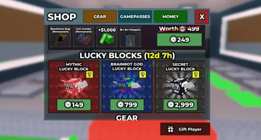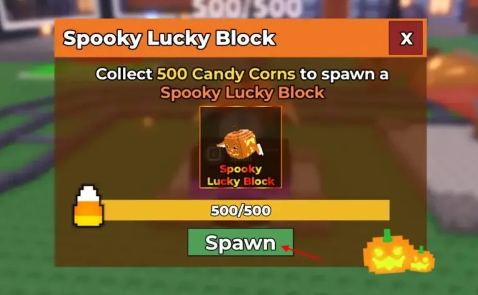 Можно получить как брейнрота, так и конфеты. Накопив 500 конфет, подойдите к Тыквоголовому Джеку возле магазина. Нажмите E и выберите функцию Spawn, чтобы призвать Спуки Лаки Блок на красную дорожку. После этого можно совершить покупку за 350 000 000$.