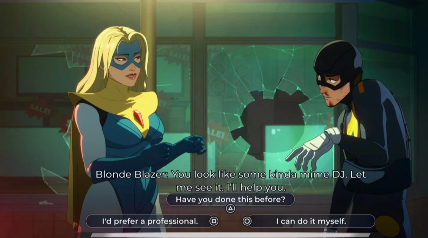 После того, как Роберт начнет получать удары от грабителей, вмешается Блонди Блейзер и разберется с ними. Она обратит внимание на вашу руку и предложит помощь в лечении, предоставляя вам следующие ответы (они не имеют влияния):
