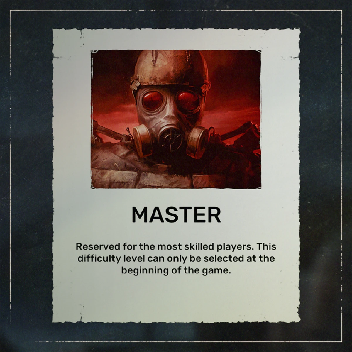 Этот режим создан для ветеранов Зоны, желающих испытать себя в экстремальных условиях: дефицит ресурсов, износ снаряжения, взлетевшие цены у продавцов и, возможно, полное отсутствие интерфейса. Выбрать уровень "Мастер" можно будет только в начале игры.