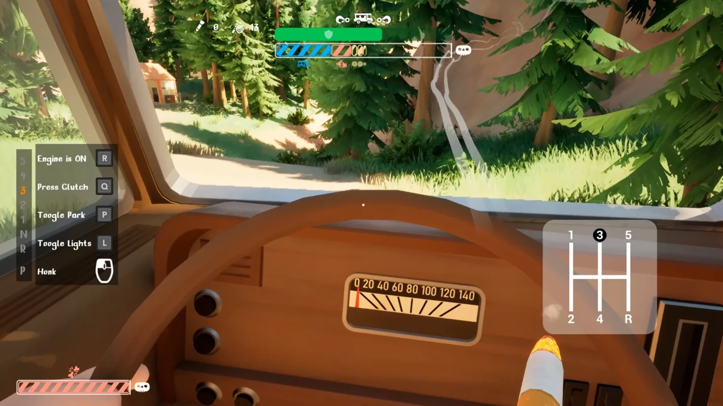 Оказавшись за рулем, обратите внимание на доступные команды. Трансмиссия в игре реализована как механическая, требующая ручного управления сцеплением: нажмите и удерживайте клавишу Q, переключите передачу, затем отпустите Q.