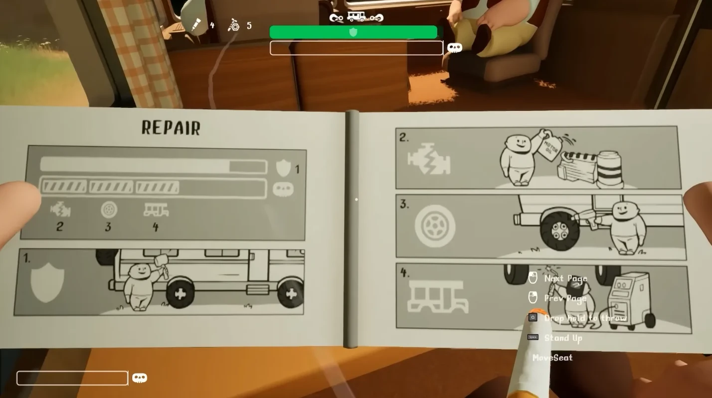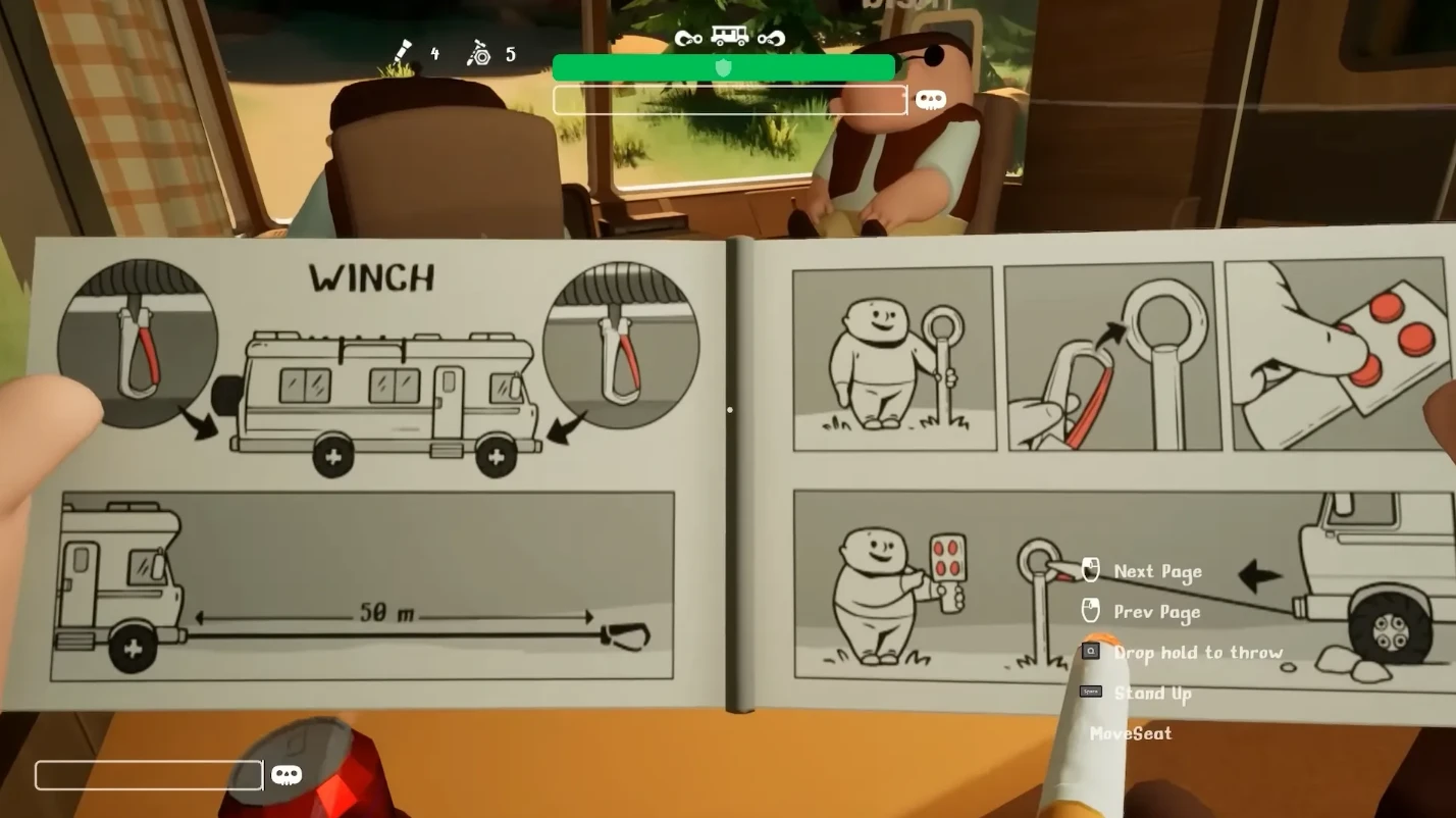 Вождение и починка фургона – это ключевые аспекты RV There Yet. Обычно один игрок управляет транспортом, а остальные занимаются ремонтом, управлением лебёдками, добычей ресурсов и приготовлением пищи.