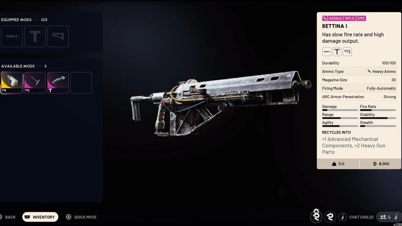 Беттина — штурмовая винтовка эпического уровня. Обладает высоким уроном и бронепробиваемостью, что делает её эффективной против крупных врагов-ботов. Оружие обладает ощутимой отдачей, поэтому рекомендуется вести огонь короткими очередями, что позволяет поражать цели на приличной дистанции.