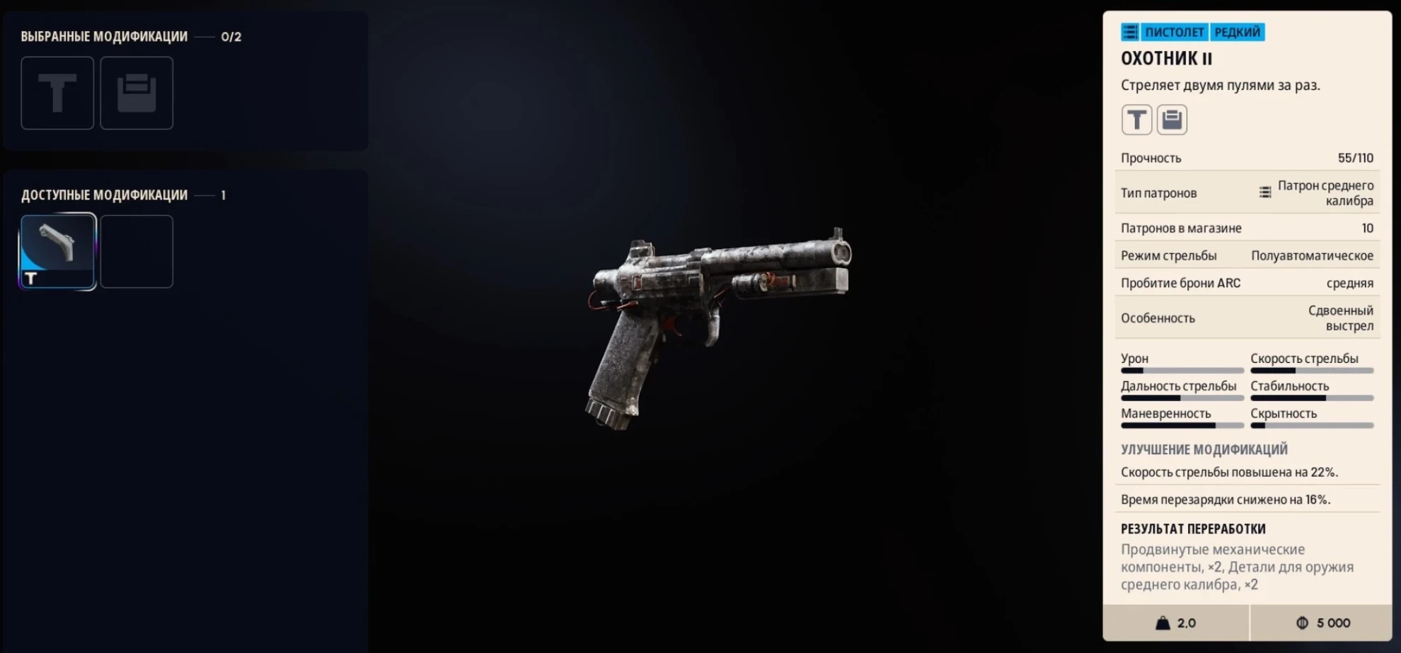 Мне особенно импонирует пистолет "Охотник", и на это есть ряд причин. Прежде всего, это самое легкое оружие в игре – всего 2 кг (в сравнении с 3 кг у "Заколки"). В отличие от "Заколки", "Охотник" характеризуется значительным потенциалом урона благодаря высокому темпу стрельбы, обеспечиваемому полуавтоматическим режимом, и выпуску сразу двух патронов за выстрел.