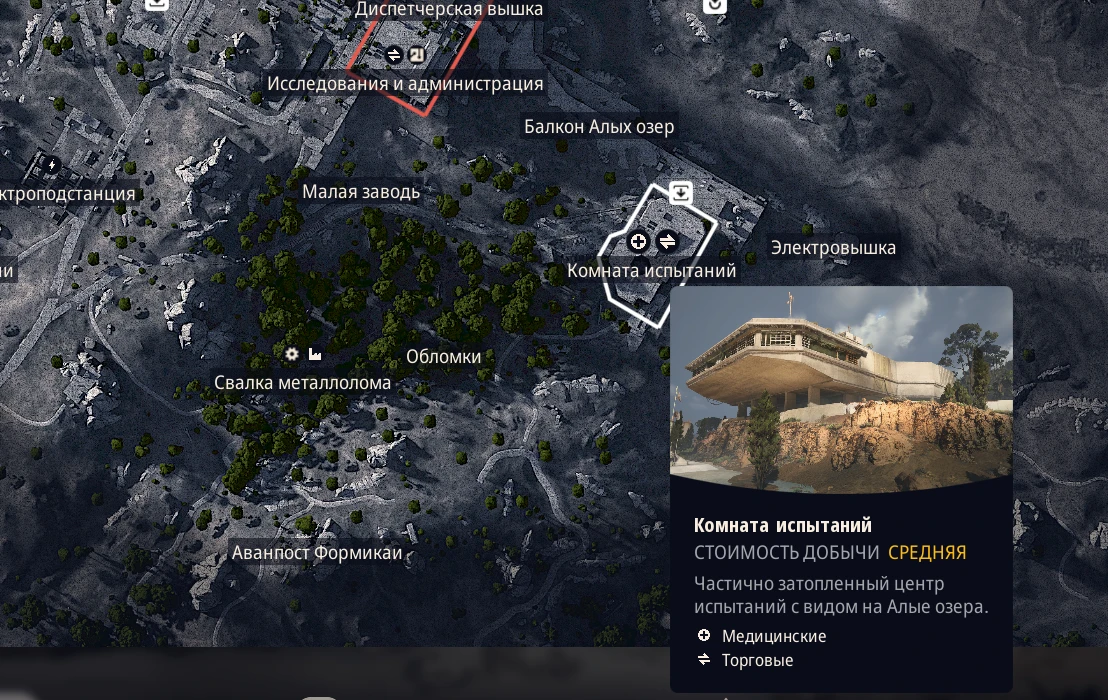 Эта зона средней сложности расположена на окраине карты и предоставляет хорошие возможности, особенно при удачном старте. Ключ от испытательного полигона открывает доступ к дополнительной добыче, но и без него здесь можно найти много полезного.