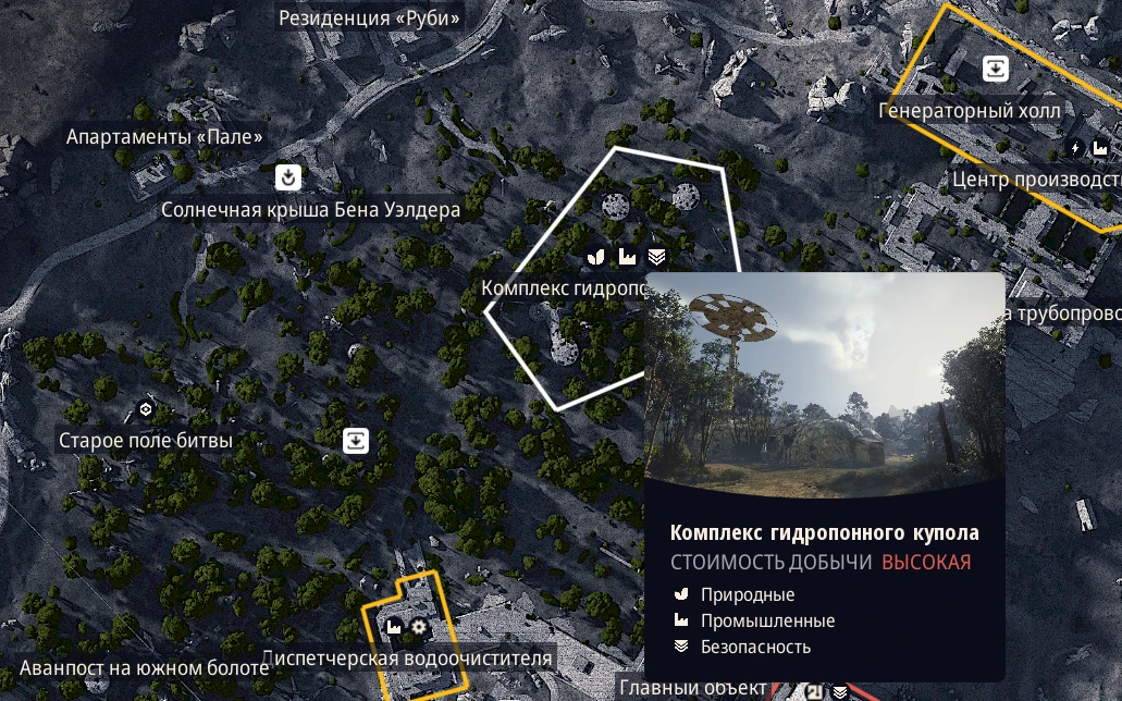 Здесь встречаются коммерческие и медицинские ресурсы, поэтому это неплохое место для подготовки к дальнейшим вылазкам. Несмотря на присутствие других игроков, из-за планировки комплекса их легко избежать.